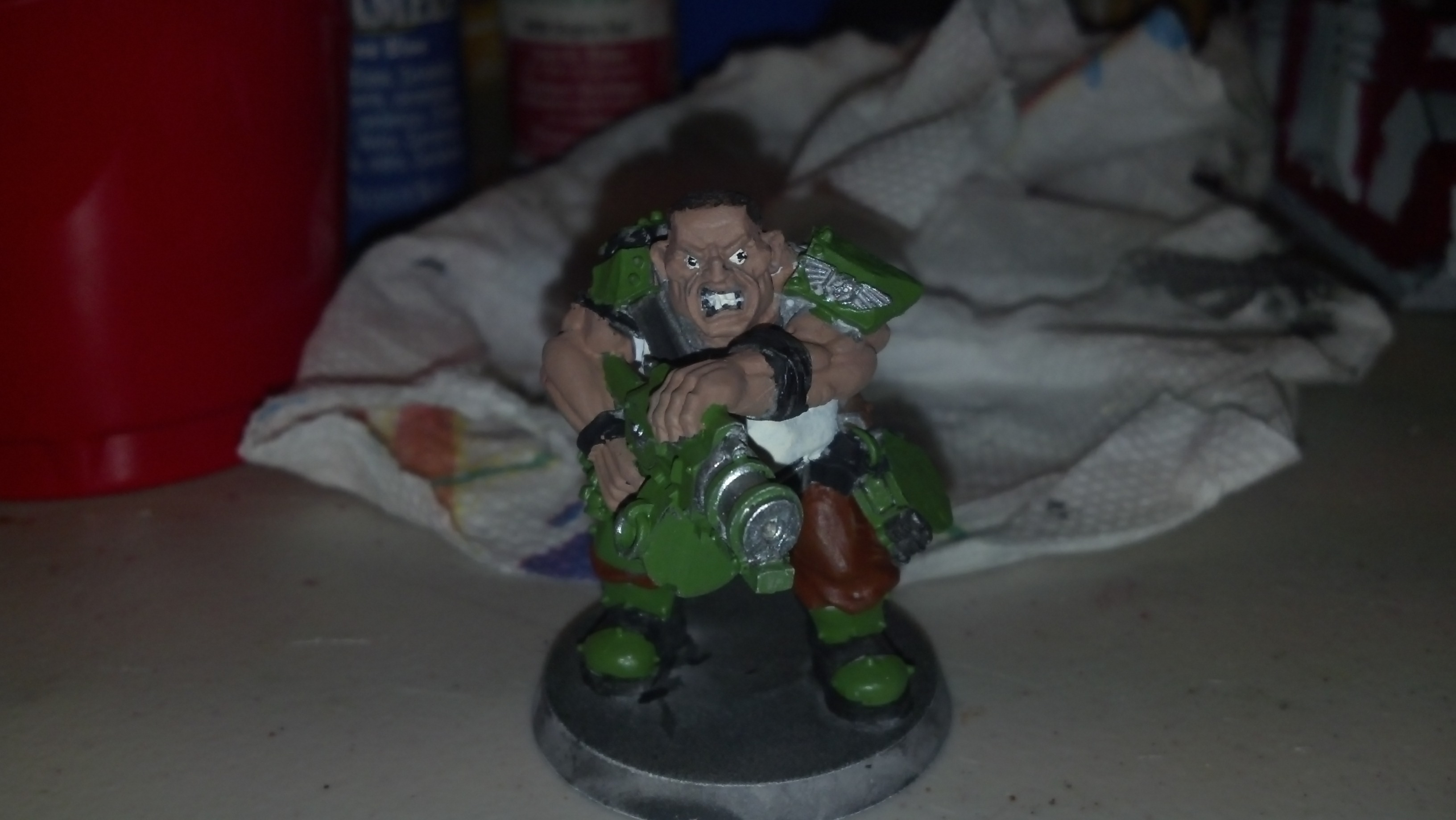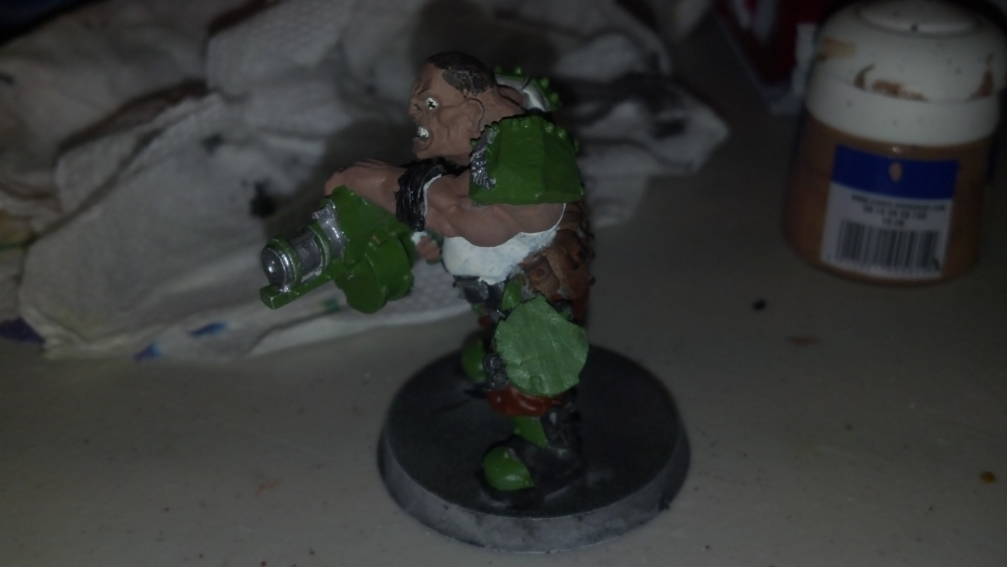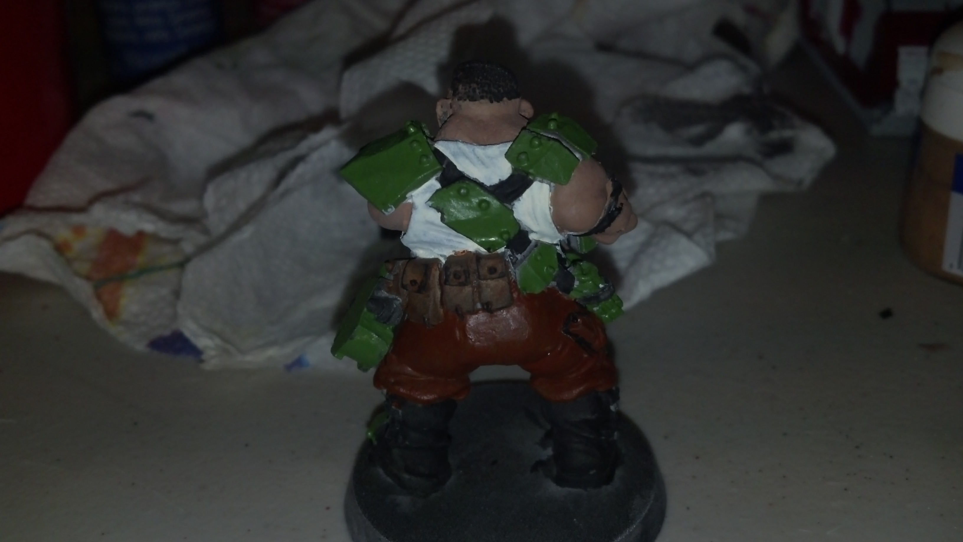 Ok so here is an Ogryn I did last night. took about 3-4 hours on him. I did the best I could. There was a wash under the white coat of primer but I don't think that came through. Besides that I only did black highlights on the pockets because they looked funny just matte brown.