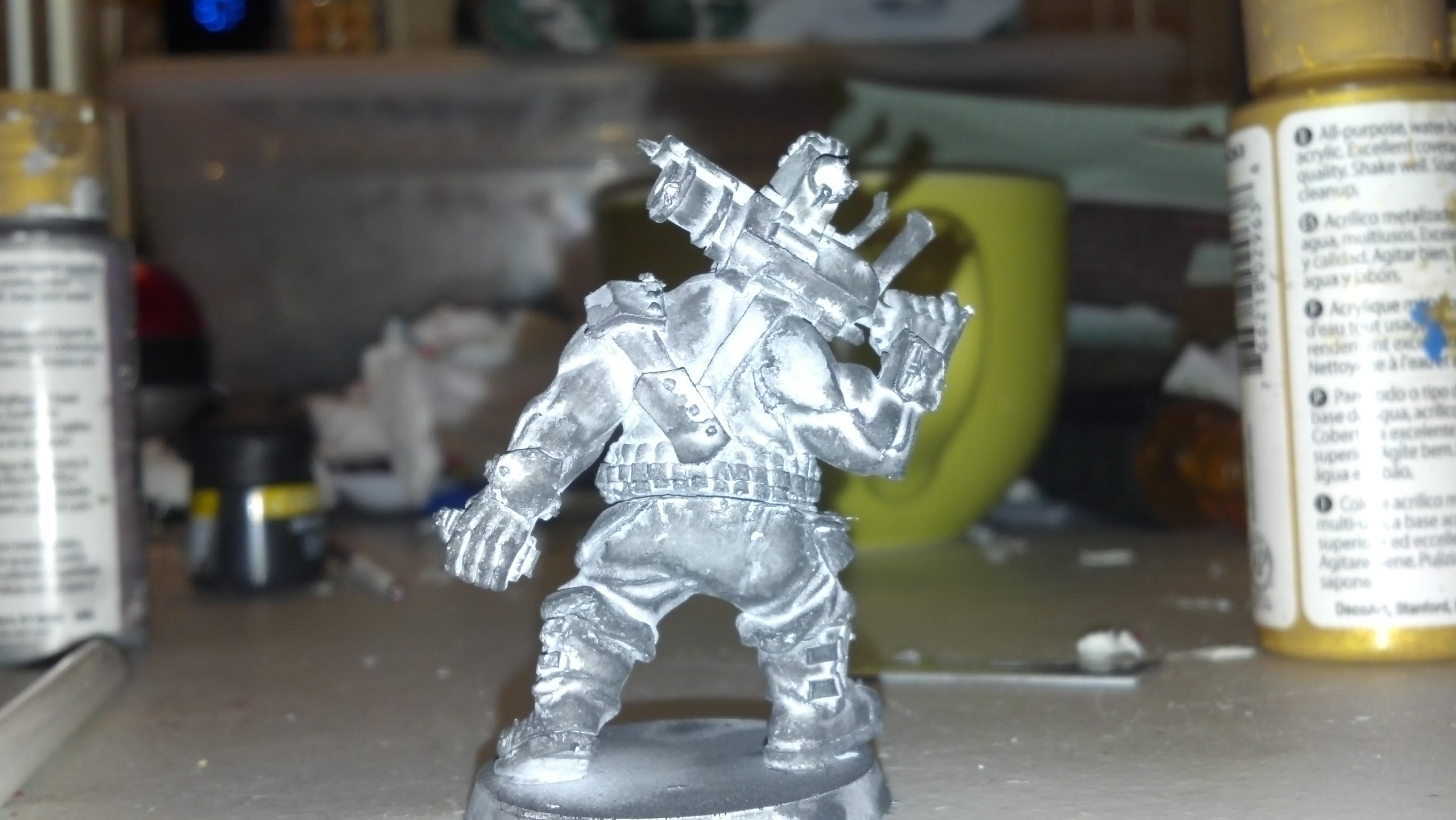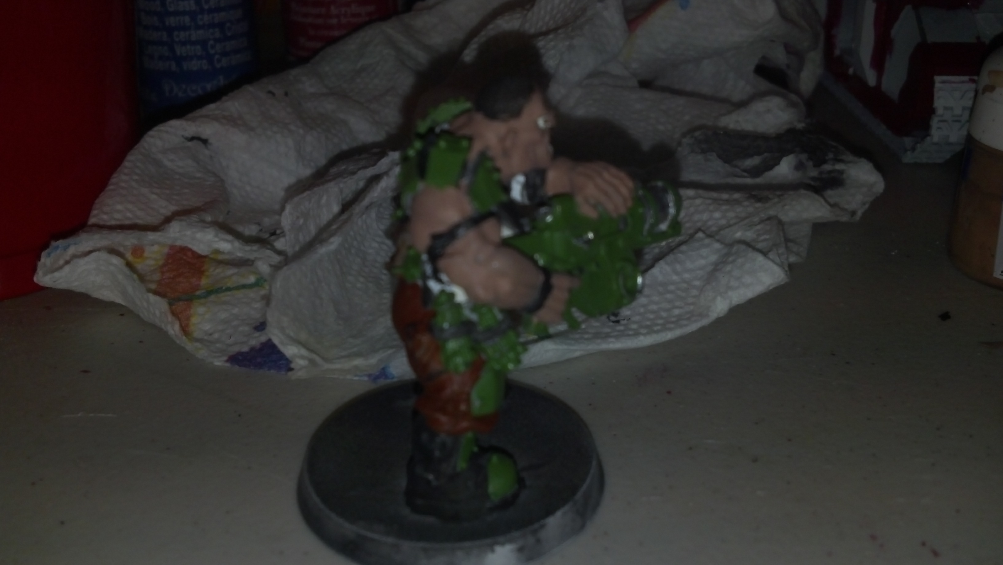 But I just discovered the optivisor. A super-dorky headset that magnifies 2-3 times what you're looking at. Holy smokes, I'm a convert! Be sure to get a good quality one, with two lenses (two eyes), as the monocular ones are really hard to get used to and you'll end up painting eyes on foreheads, etc. Just do a google on it, I paid about 30 US$ and it was worth every penny. I can now outline, instead of drybrush. I never thought I'd be able to do that, as my hands are not that steady. With the uber-dork visor, my hands are steady as a rock. That alone has really upped my painting game.