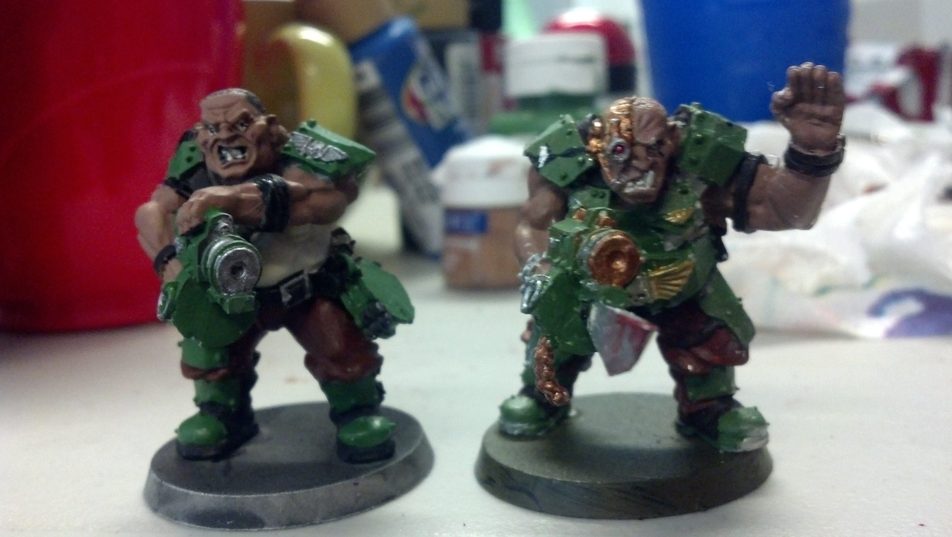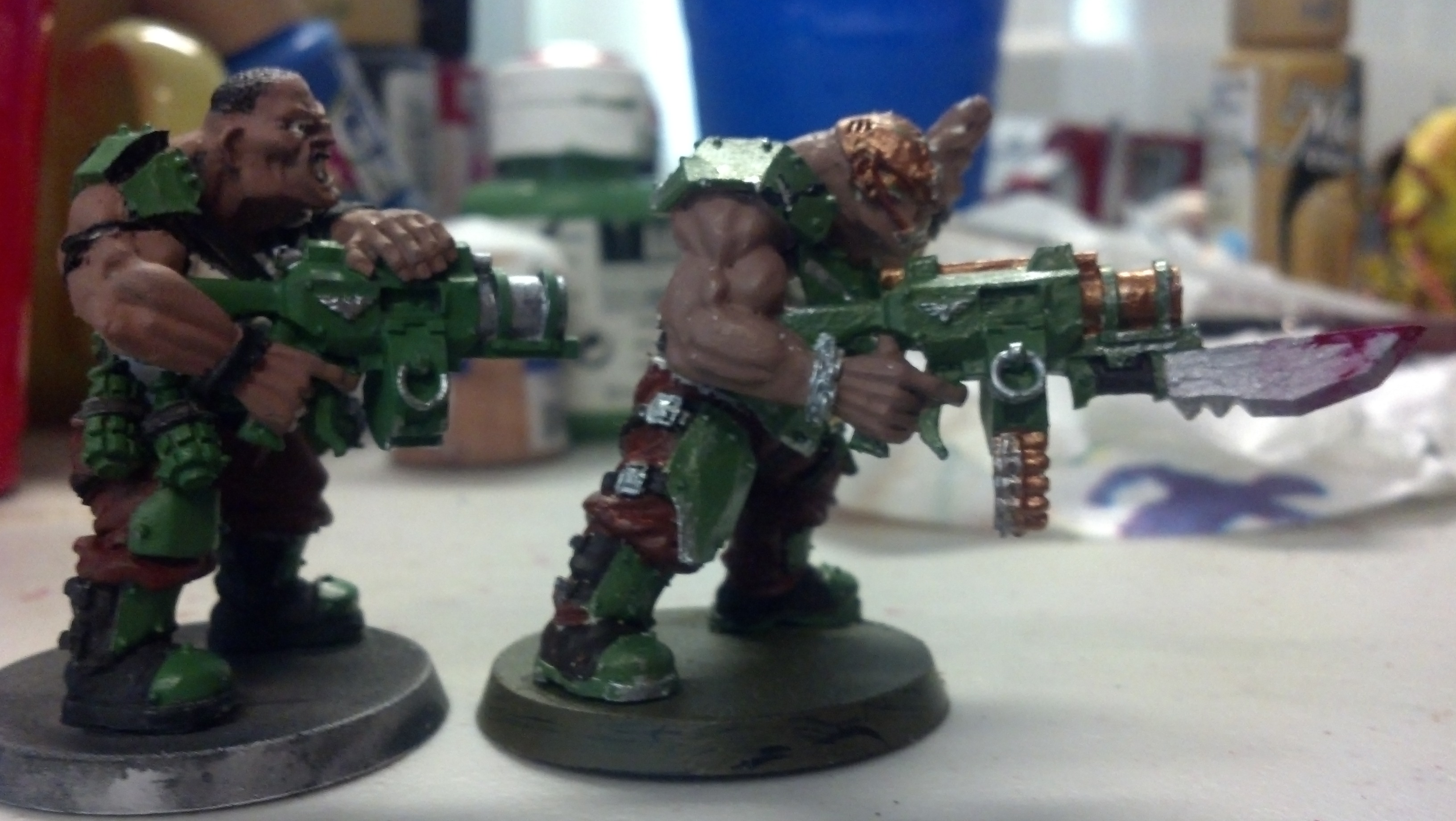 @ OP Gotta say your skin tones are good! you could add a little more depth potentially by washing with a brown/dark tone before highlighting with the top color you used? (could even base dark brown, highlight tan or w/e, wash brown, then re highlight.. thats what i like to do with my orks... well using green wash/paint of course  )