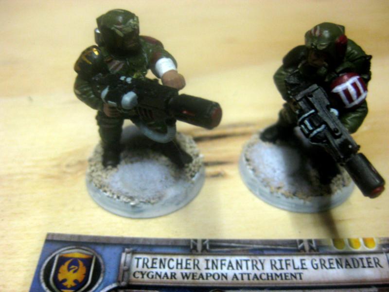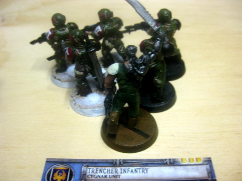 Trenchers Ho! Assault order given, one crushed by the destroyer as they disengage then they hit and manage one damage, victory to the trenchers (and the rest of the Cygnar people too I guess)!