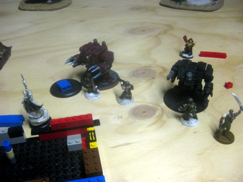 Trenchers retreat from the Destroyer, its 2 free swings hit with 1 and misses the other, crushes a trencher beneath his mighty boot. They then shuffle across, shoot into the juggernaut and do 8 damage to column 5.