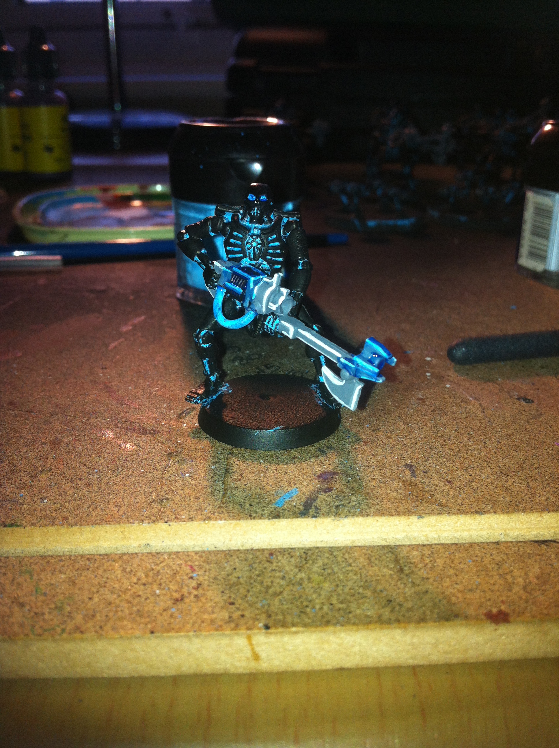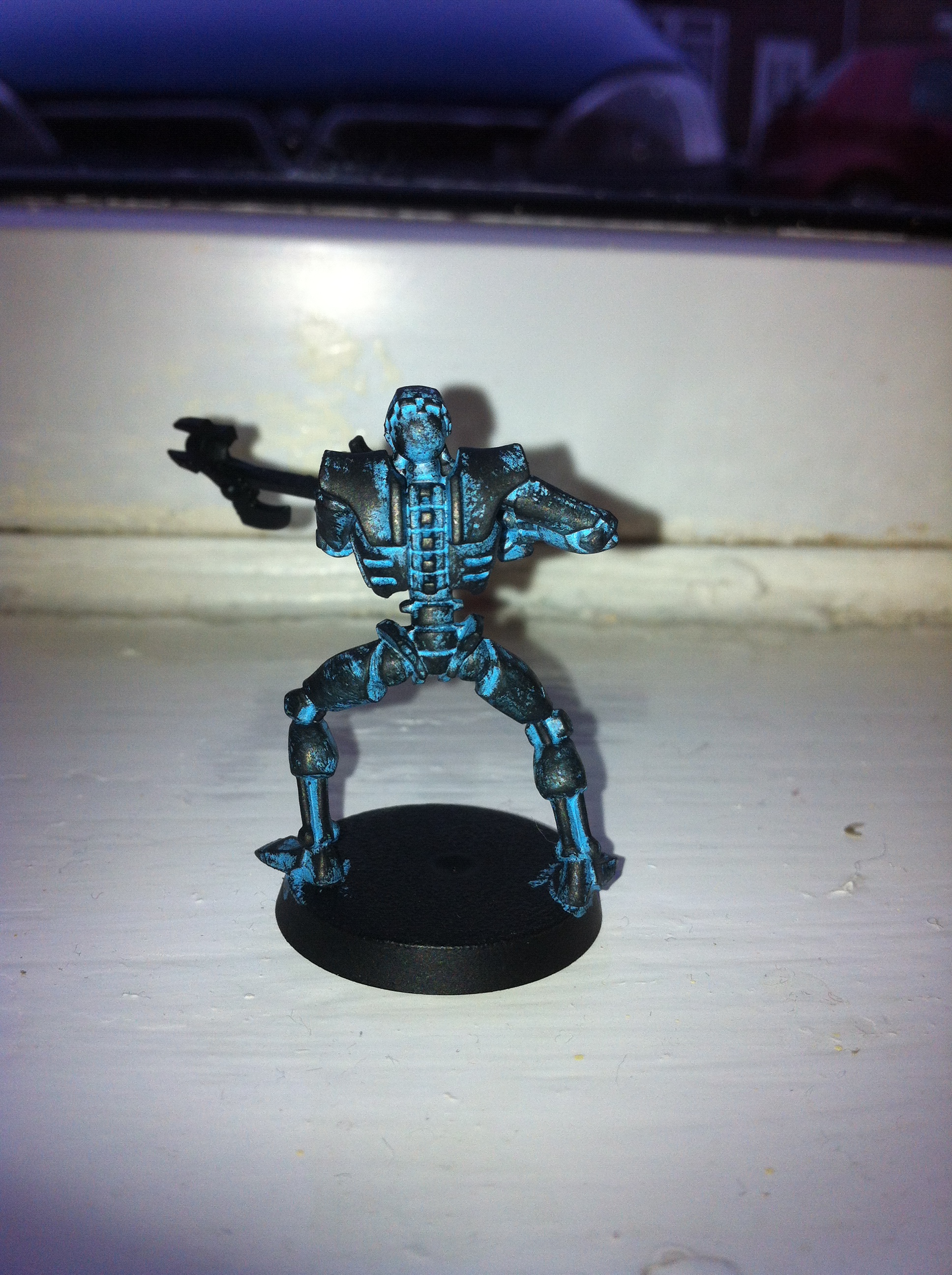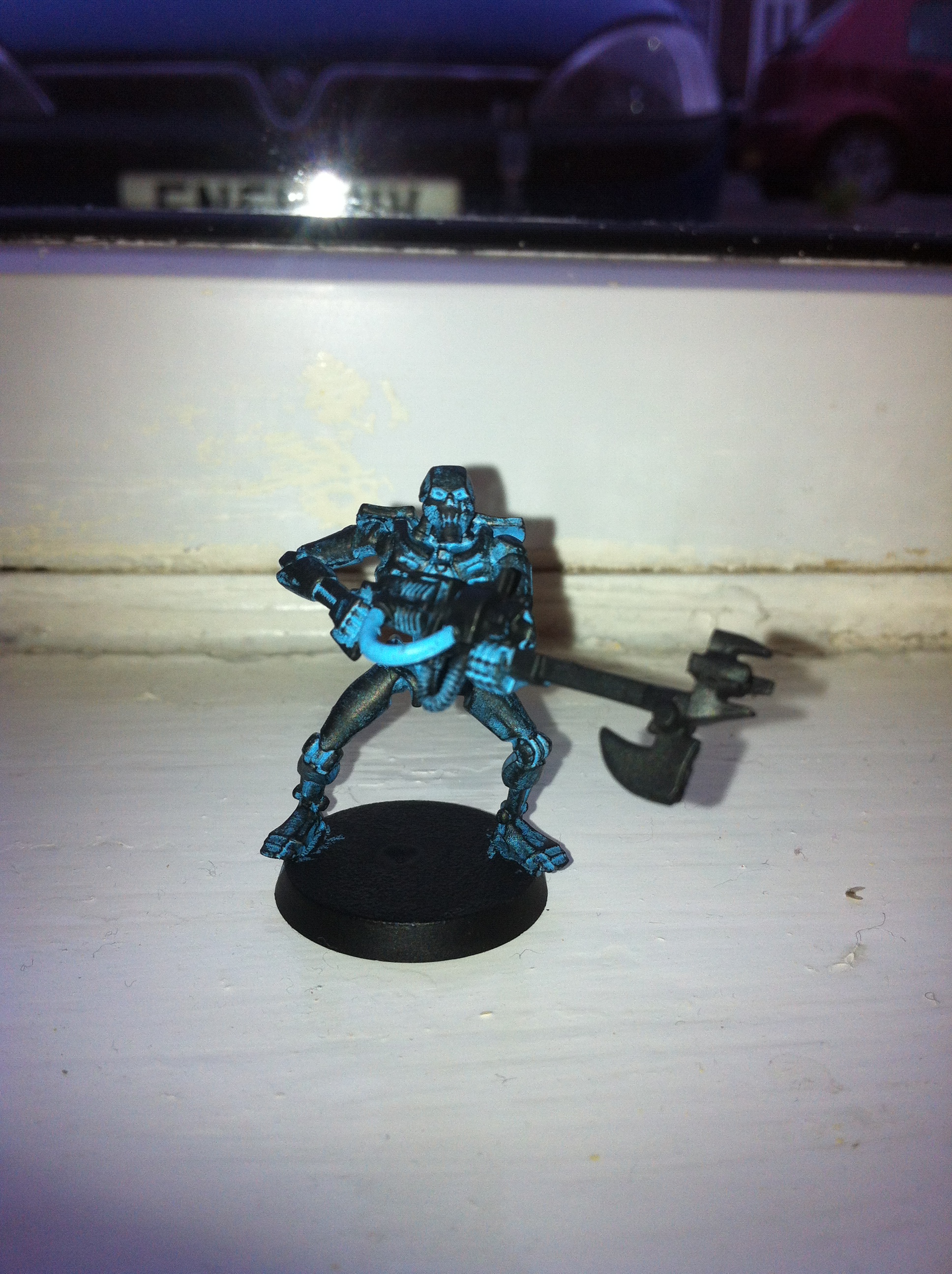 hi guys so iv strated to collect a new necron army and decided on a black and blue colour scheme because i didnt want to just go with metal and green like normal and my original idea was to have it look as if the blue was glowing out the joints and eyes so i based the warriors with ice blue and have given them a very heavy dry brush of black so the blue is only left in the recesses but im not sure if im happy with the end results and im not sure what to do with the detail ?