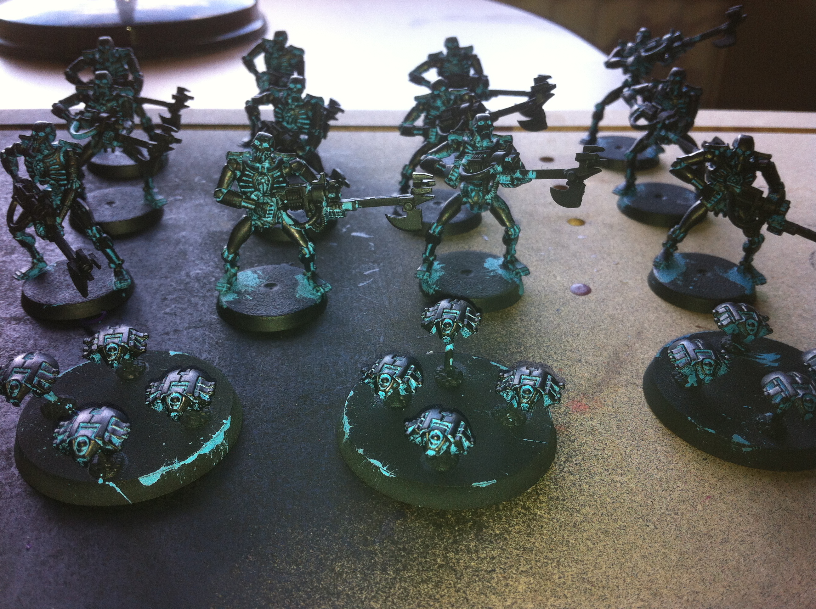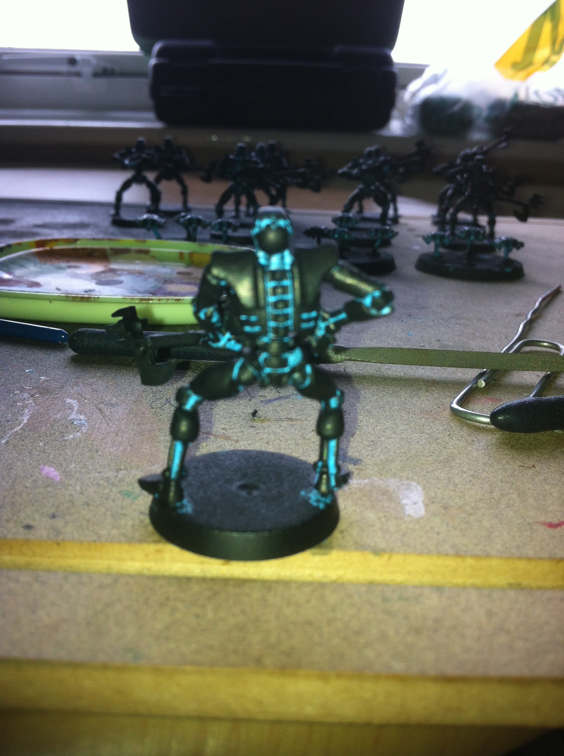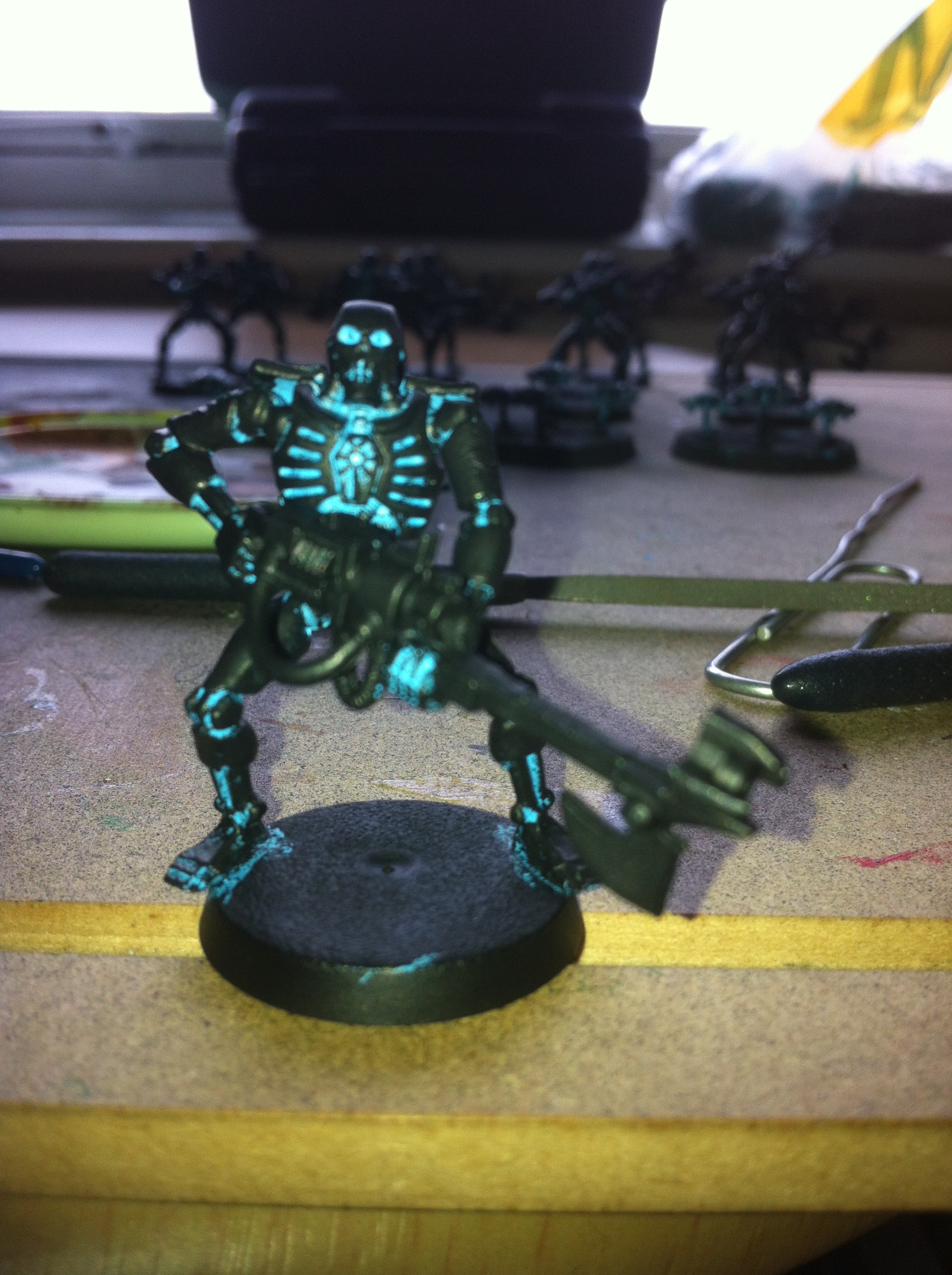 hi guys so iv strated to collect a new necron army and decided on a black and blue colour scheme because i didnt want to just go with metal and green like normal and my original idea was to have it look as if the blue was glowing out the joints and eyes so i based the warriors with ice blue and have given them a very heavy dry brush of black so the blue is only left in the recesses but im not sure if im happy with the end results and im not sure what to do with the detail ?
