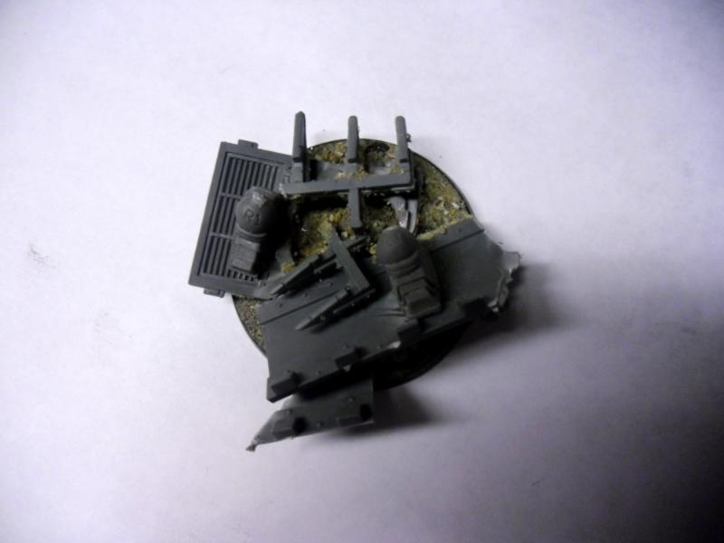 It's coming together, lads - even better, it looks a lot like the mockup!  Here's the body so far. Its a bit blurry, so here's the lowdown: it's a contemptor relic, with a talos faceplate and talos arm guard covering the aquila. Chaos smokestacks cover the pipes on his back vent.  His naughty arm, which is earning him the nickname "The ConTRAPtor Dreadnought". The tentacles are from the talos, cut down and made to fit into the close combat arm's finger holes and gun housing. The legion icon of the Emperor's Children is displayed on his shoulder, made using a Sanguinary guard wing and the studded hand from the Talos.  His sonic blaster arm. I know, very blurry. However, it scales up perfectly with the contemptor model.  Here's the guy's rubble base. Not much to say, just an IG dozer blade, a razorback roofing plate, and a chaos dozer blade.