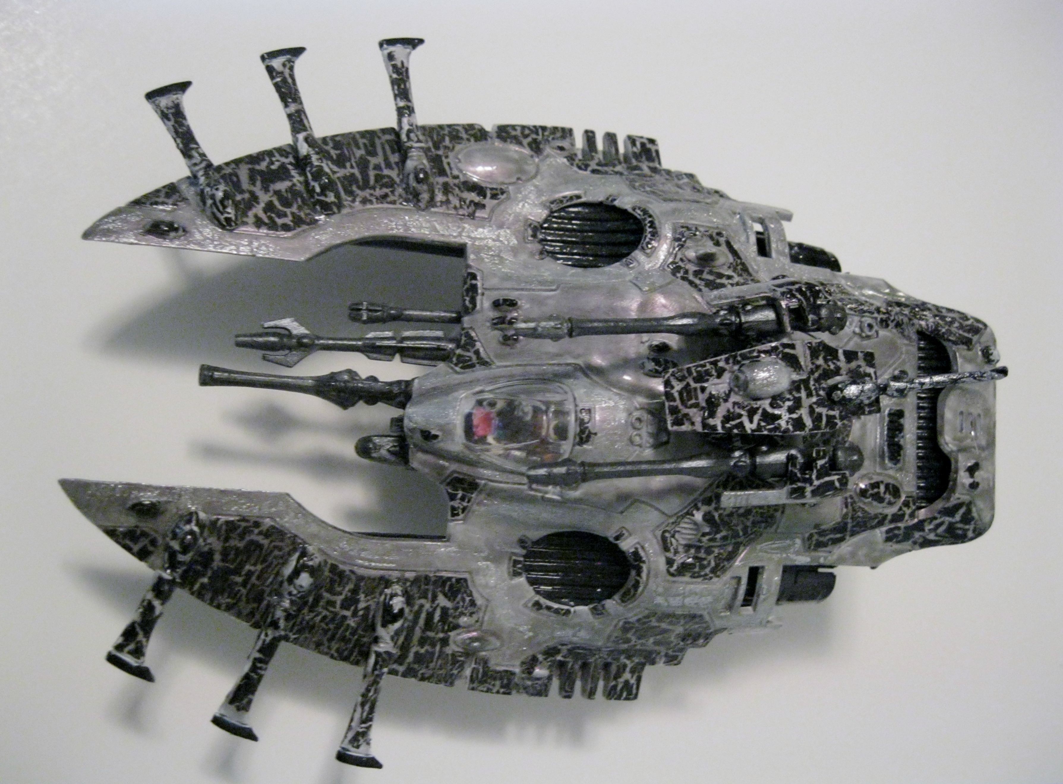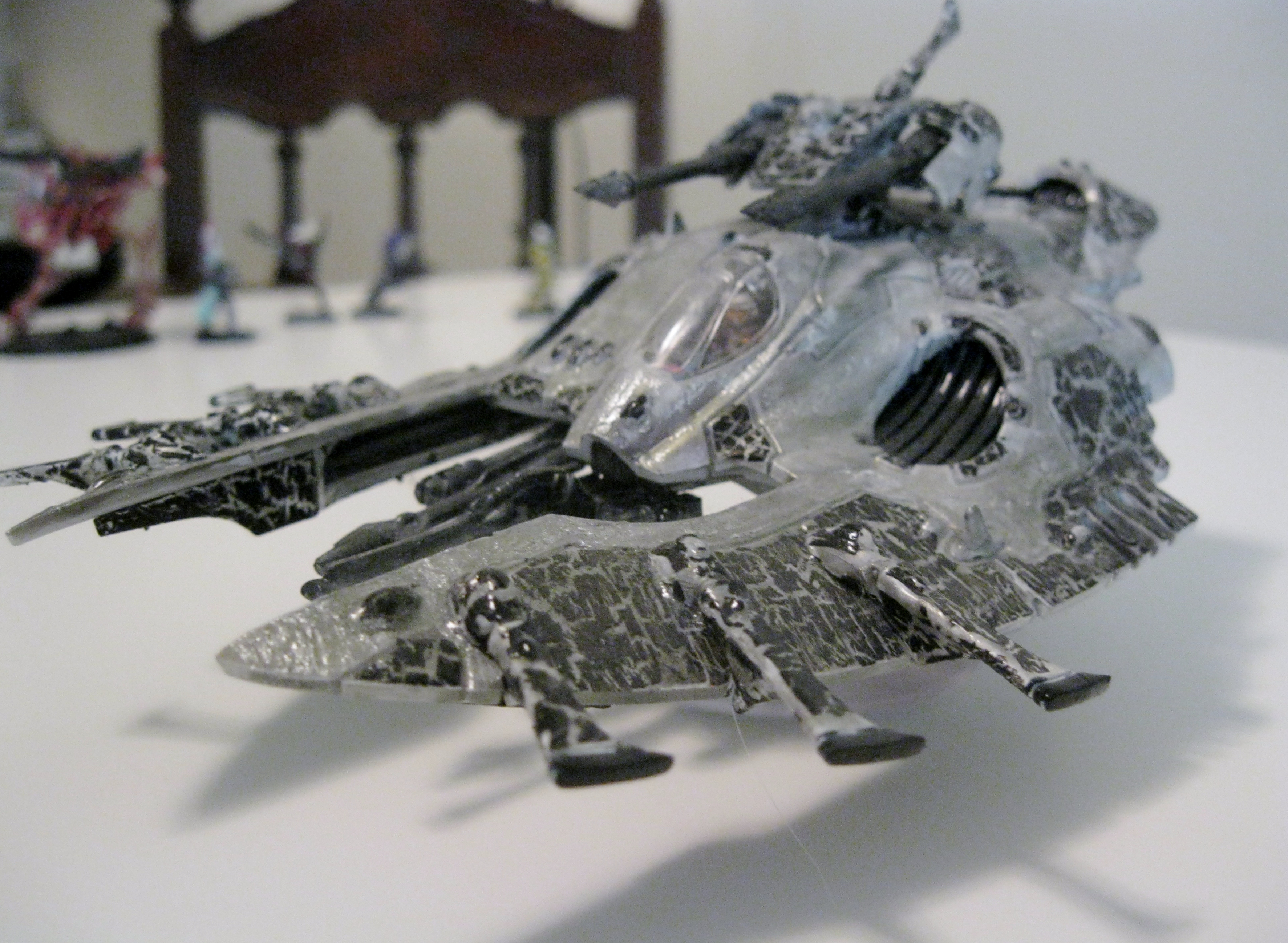 When you start to play with things like those though - the way that you consider your painting changes a bit. The various blended surfaces that get a lot of oooohs and aaahhhhs on miniatures don't normally look right when painted with those paints. Instead, you use a solid color and the actual surface properties of the paint provide the interest. We did a friends Eldar army up in the prismatic chrome. It has the oil slick look to it - but is very shiney as well. The finish actually picks up and reflects surrounding objects - so when he has a load of Dire Avengers or Scorpions with their blue or green reflected off the chrome it looks really nice. We ended up only using it on the flat body panels - other parts were painted with other paints/colors (the exhaust was done using their metals though). Gemstones had a candy red finish which matched the rest of the army's color scheme.