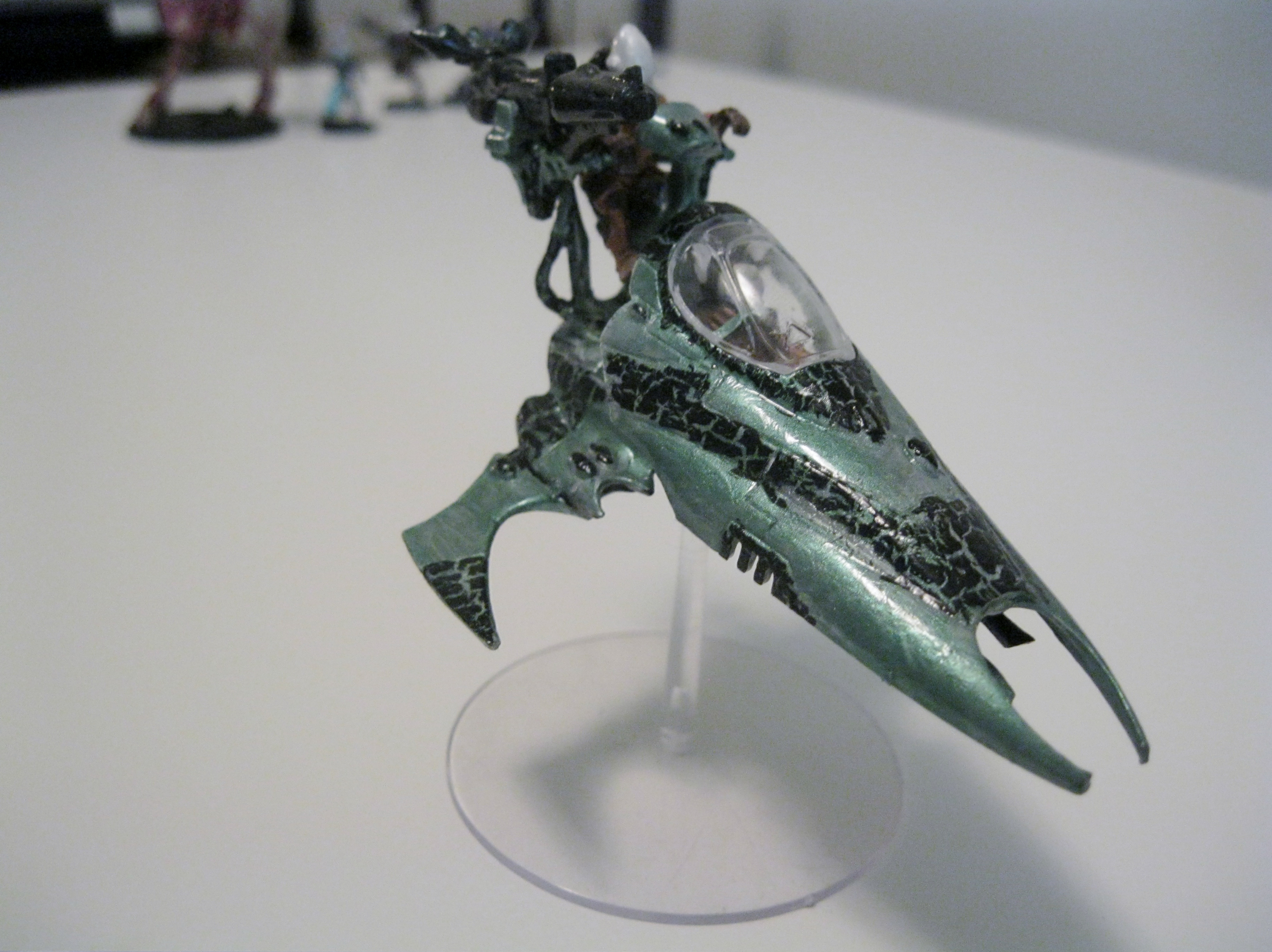 TheHarleqwin wrote:When you start to play with things like those though - the way that you consider your painting changes a bit. The various blended surfaces that get a lot of oooohs and aaahhhhs on miniatures don't normally look right when painted with those paints. Instead, you use a solid color and the actual surface properties of the paint provide the interest. We did a friends Eldar army up in the prismatic chrome. It has the oil slick look to it - but is very shiney as well. The finish actually picks up and reflects surrounding objects - so when he has a load of Dire Avengers or Scorpions with their blue or green reflected off the chrome it looks really nice. We ended up only using it on the flat body panels - other parts were painted with other paints/colors (the exhaust was done using their metals though). Gemstones had a candy red finish which matched the rest of the army's color scheme.