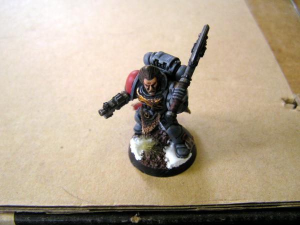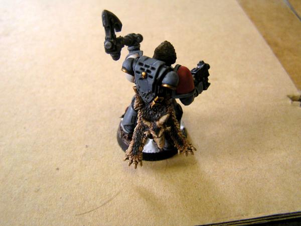 It's not a very good picture, but in the end it comes out looking similar to the Space Wolf on the front cover of the current Codex with dark and slightly purple reds, golds and the darker grey that isn't quite as blue as most Space Wolves.