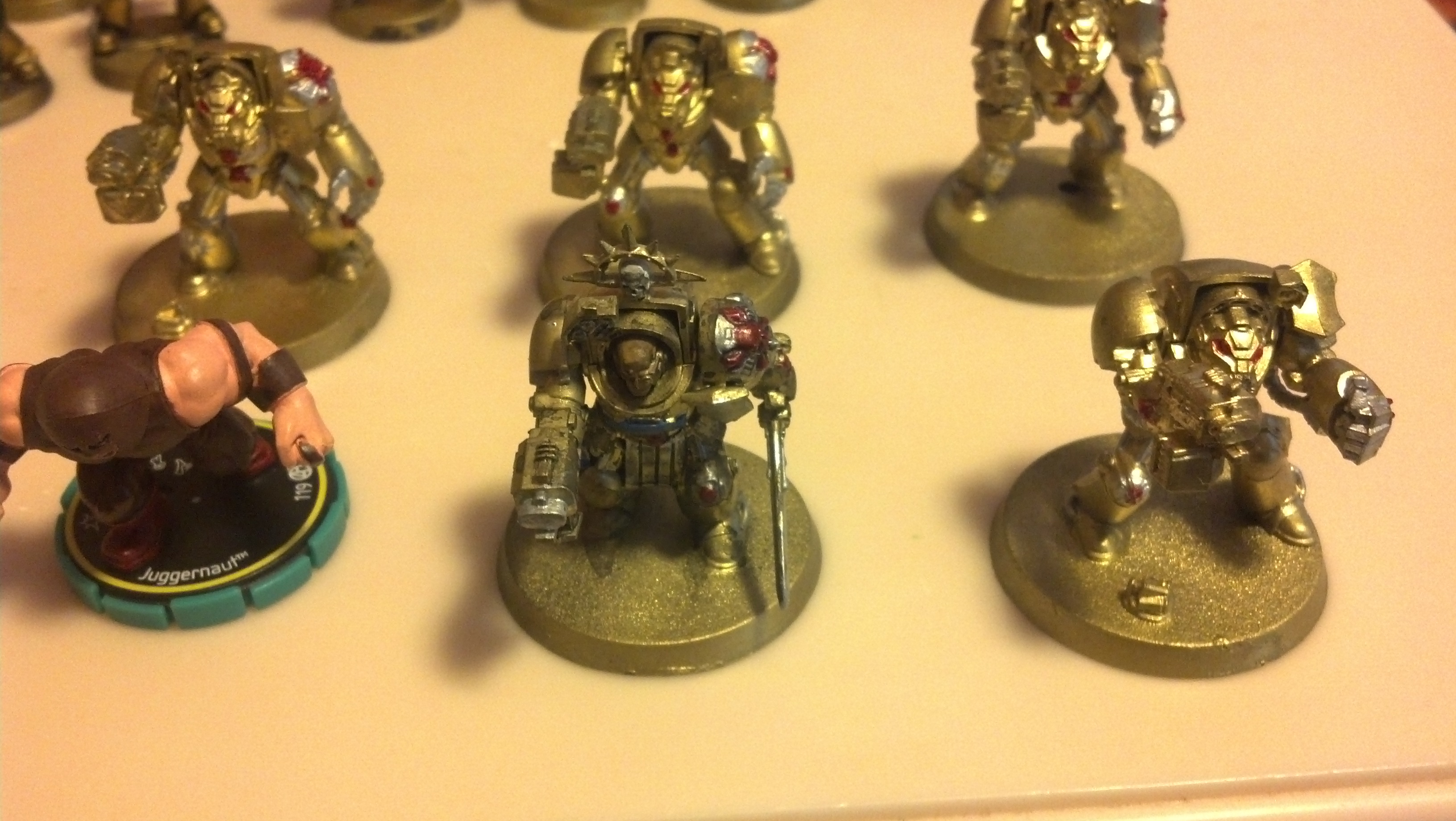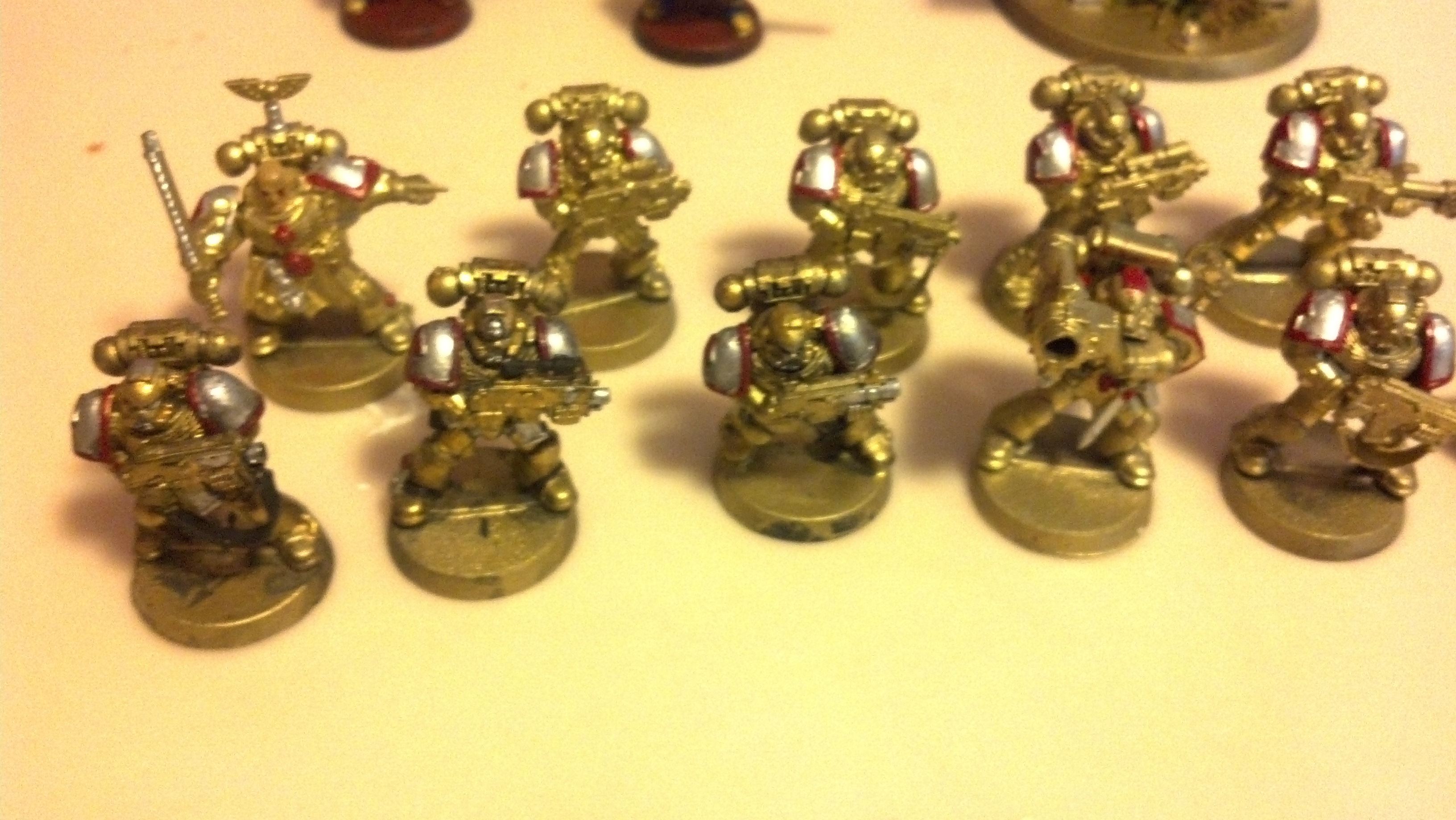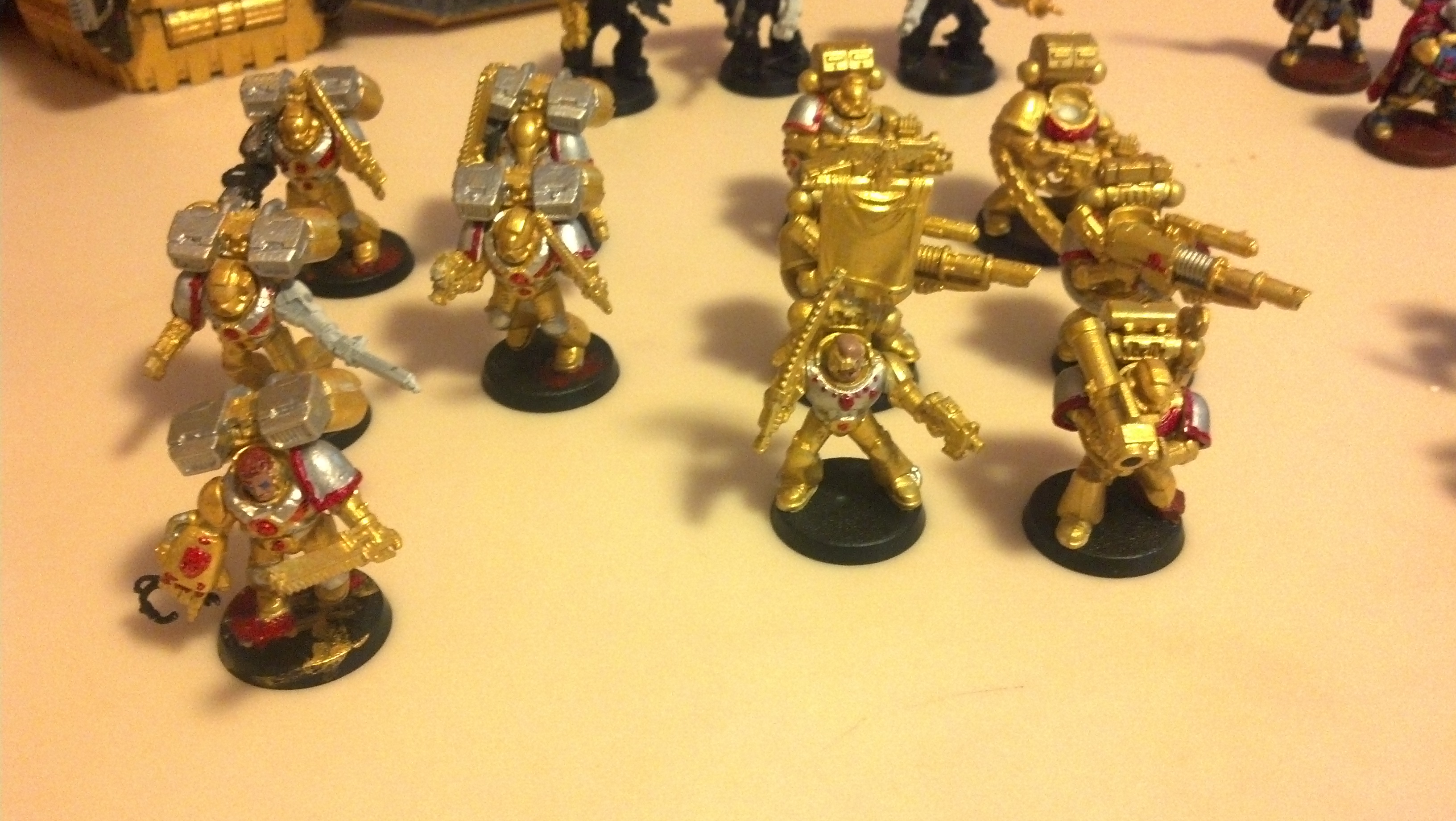 AoBR and work my way up to what I have now painting and learning along the way. They are all meant to be a "Cured" fresh cloned batch of Lamenters with brand new shiny armor. I don't want to battle damage / weather them as it does not look good on gold. I may add a Agrax Earth Shade to the Silver since the color that comes out of that is really good. Besides that I was thinking of going back in with more red and black and fixing them up. Also Highlights are impossible to do on gold. For my later models - Yes they are covered in 10 dry brush coats of gold.