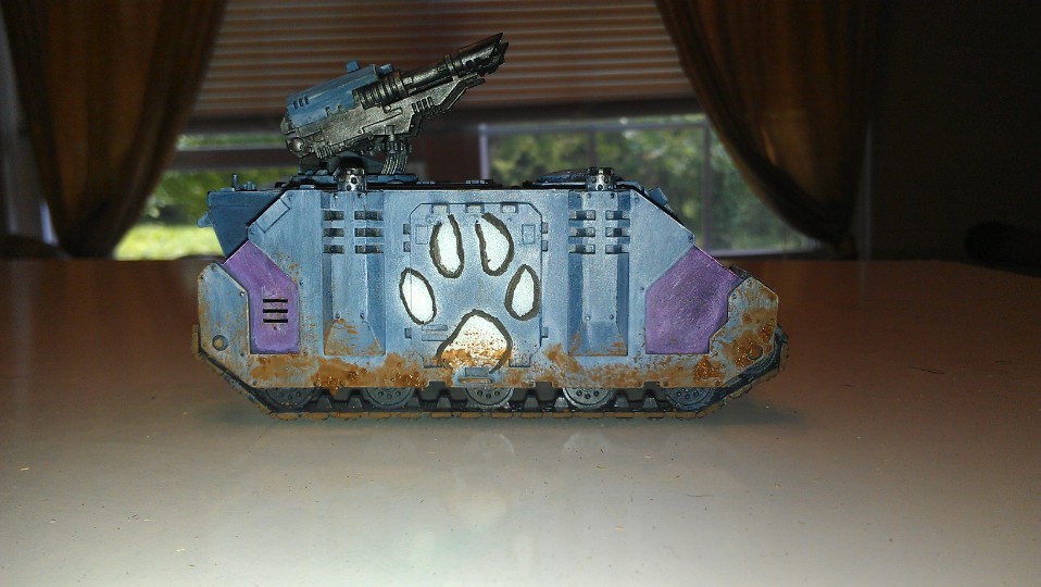 This is my razorback i had just finished today.The purple is a squad marking for my long fangs that will ride along, i will have multiple transports and will give them all a colored marking for the squad that rides along.