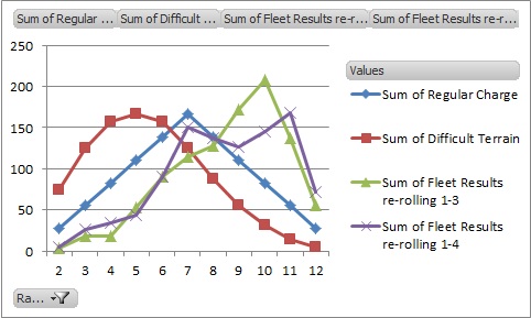 Red represents charging through cover, blue is charging in the open, green is fleet re-rolling 1-3, purple is fleet re-rolling 1-4)
