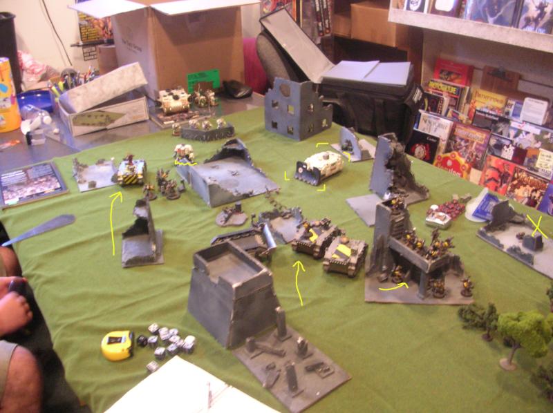 The (undead) Rhino chasing the Vindicator knocks off a second hullpoint with a rear armor bolter glance. The plasma squad moves up and dumps out near the objective. The Lord aces the Terminator on the objective, letting the Marines run on and clear it.