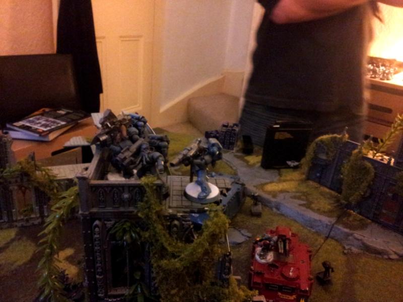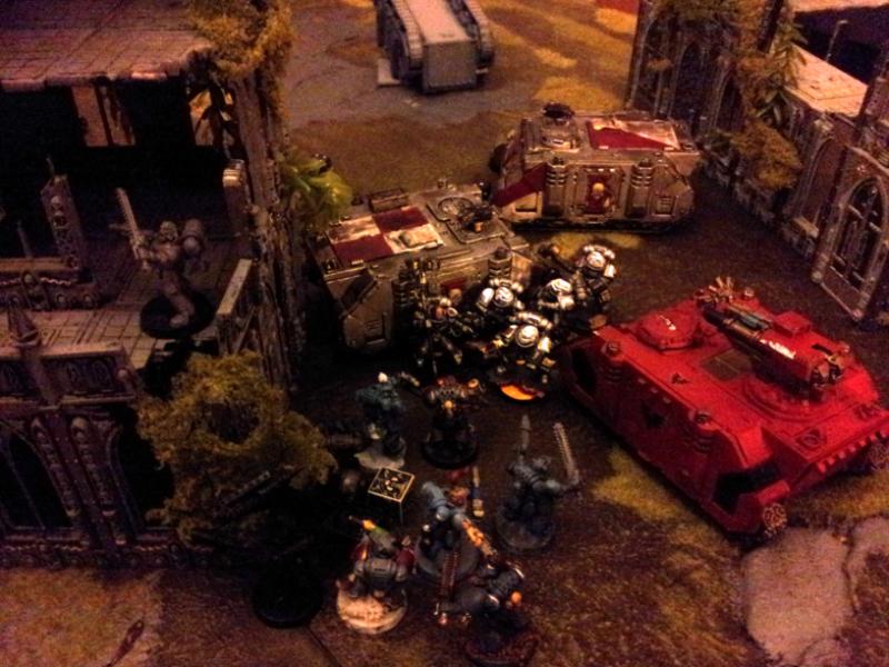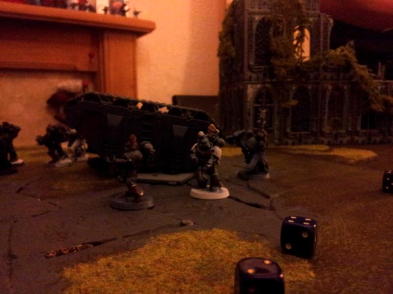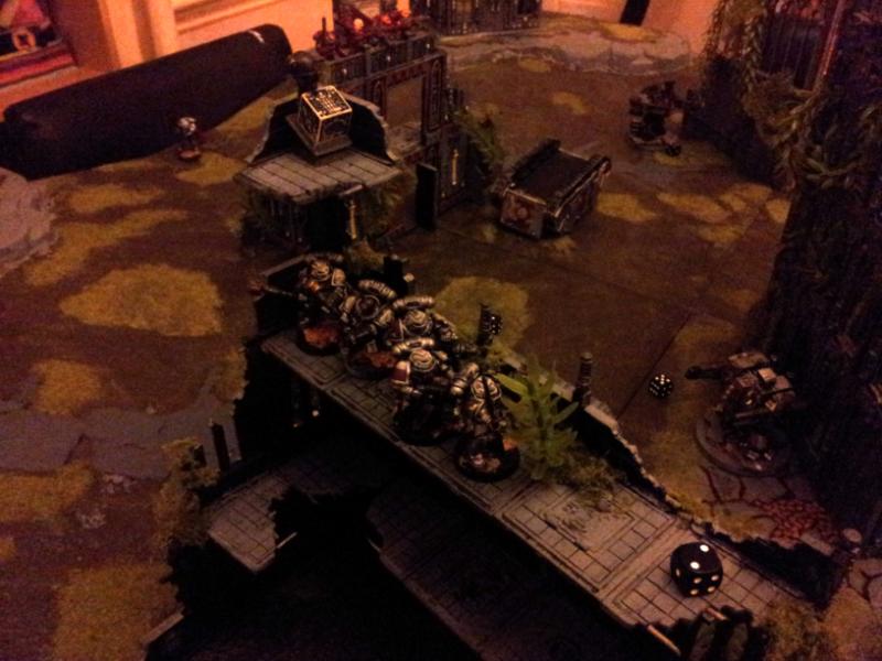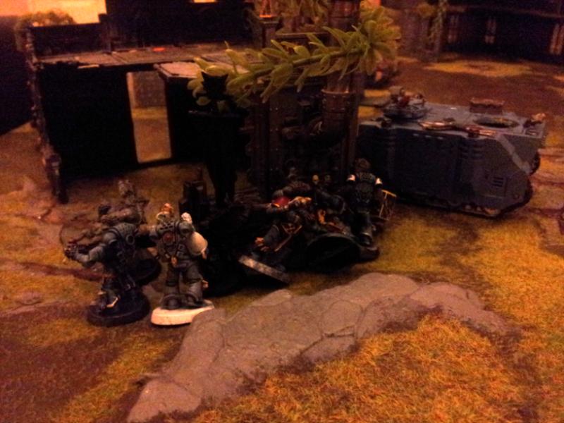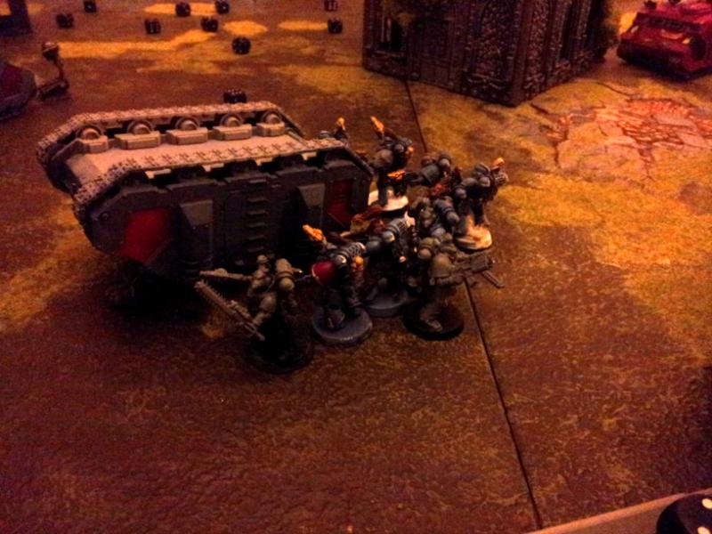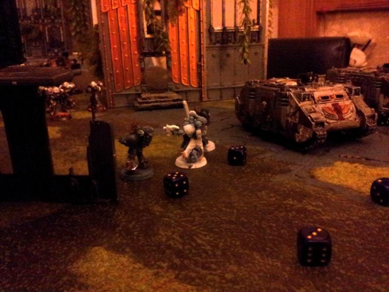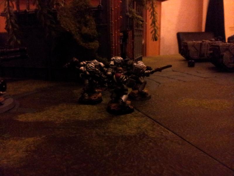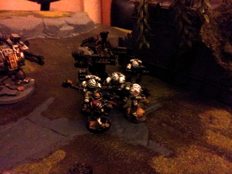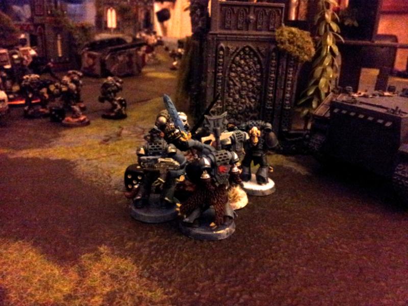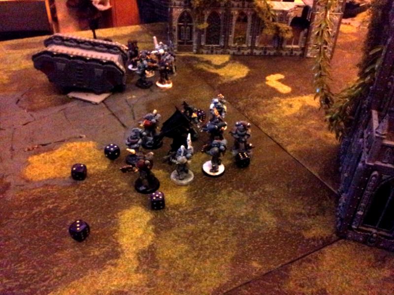 Assault; Crowe does his blade arc thing and kills two Space Wolves, though the Grey Hunter with mark of the wulfren gets revenge and kills Crowe; squad consolidates back towards Shaun's deployment zone.