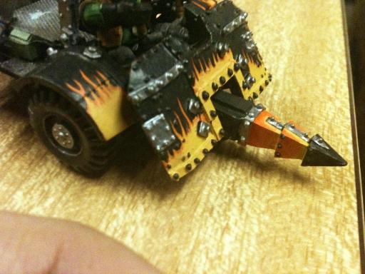 the problems I'm running into are a) I'm not real fond of the hotrod-style flame pattern, but don't know what else to do, b) the GW yellows and oranges are horribly chalky, so getting a smooth layer down even after lots of thinning is beyond me and c) the colors don't feel like they have enough pop to me. not sure if that's because it's sitting in a black field or because I'm just not using the right colors.