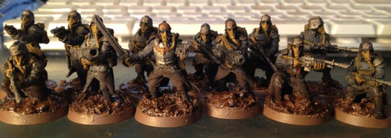Hey! First of I should say that anyone who has been following the 'muddy times' blog will probably be disappointed with my level of painting as this is my time painting warhammer after a near 10 year break :p Nonetheless I think having a paint blog will keep me a bit more inspired to get through the lets be honest fairly monotonous task of painting up a IG army. anyway, first batch of 8 is done! IMG_0434 by t4bby1, on Flickr The bases need another layer of mud and then I will paint them brown as they are too dark and then add a touch of glossy varnish to make the mud look a bit wetter. Any advice or tips are always welcome