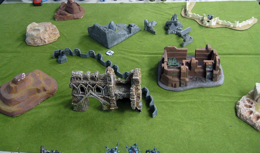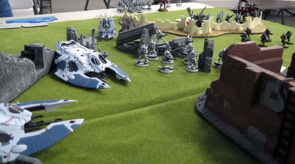 I was able to get out for my first real game in 3 weeks and practice for this weekend's event. I've been playtesting the Mordrak list here at home and I wasn't happy with the low model count so I changed the list last night to add more bodies. Kevin (Grubnards) accepted my challenge with his Eldar/Tau alliance and we had the makings of an epic cinematic showdown.