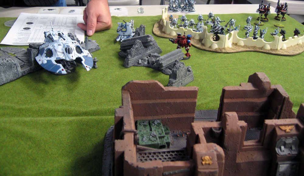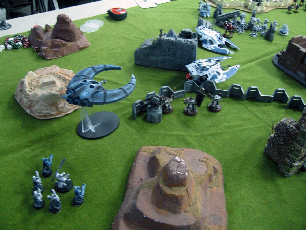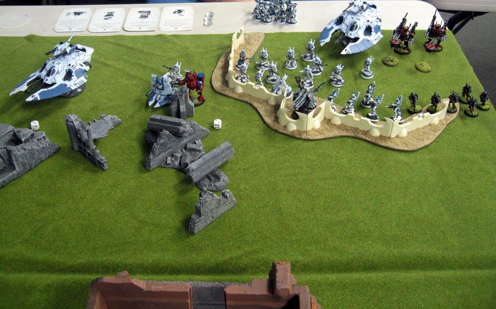 Kevin wins first turn and takes it, deploying most of his foot units behind the aegis. The Shas'O, D-cannon, and dire avenger serpent are on the left.