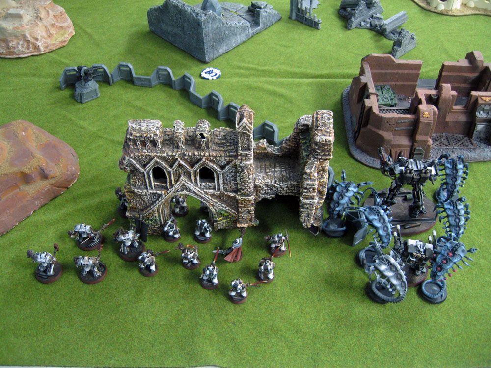I use my terrain to block as many units as possible. Terminators are on the left. They have the best chance of surviving the shooting (especially dark reapers) so I hid them to start but gave them a clear path to the relic. Strike squad is behind the big wall with the psycannons under the arch and the inquisitor safely hidden. Wraiths, rifleman, and NDK are on the right with an open lane of fire on the relic. Szeras gives the immortals +1