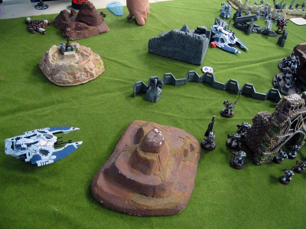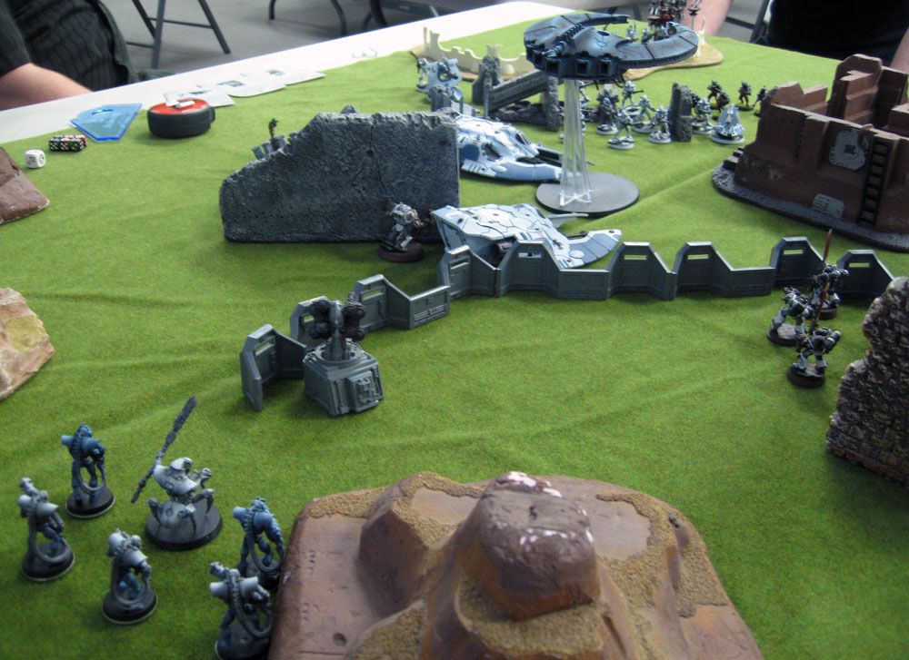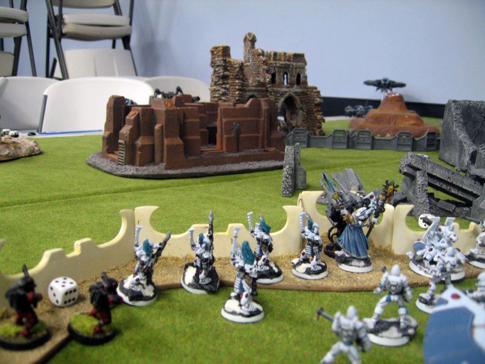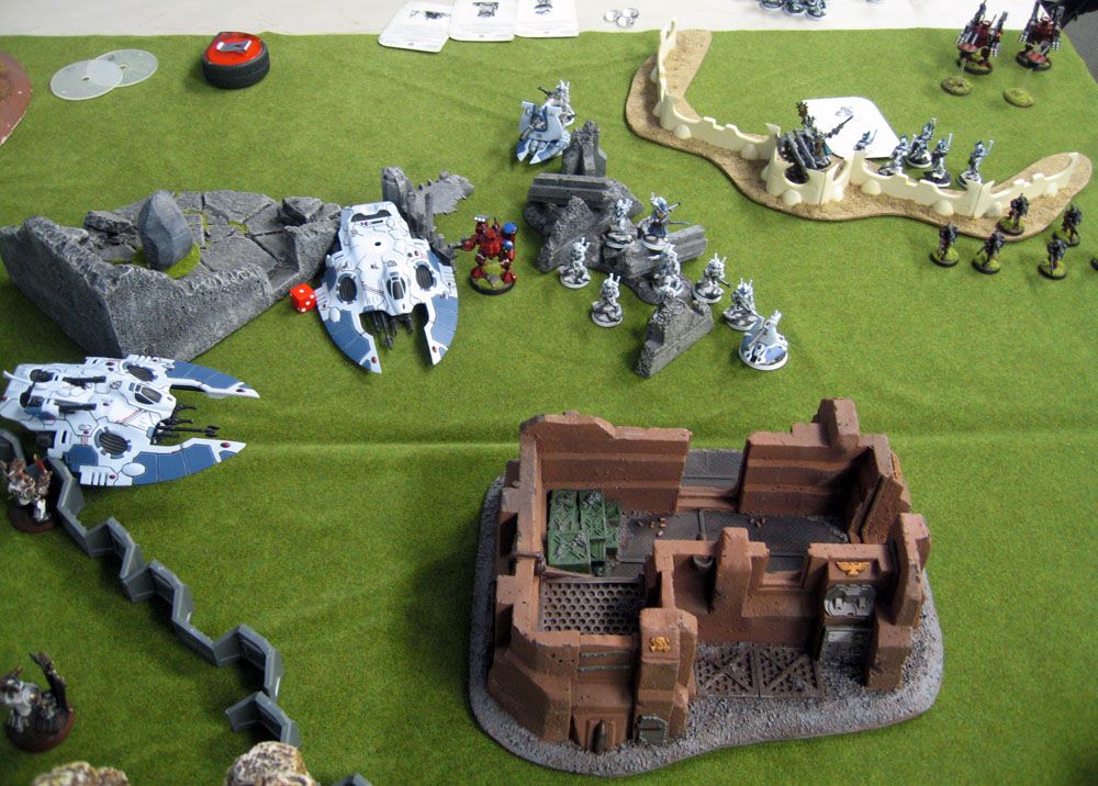 The mission was The Relic. Deployment was Dawn of War. Eldrad gets the move through cover warlord trait. My inquisitor get's the +1 assault range trait. Eldrad trades for 3 divination and 1 telepathy powers, getting Misfortune (reroll armor saves), Perfect Timing (ignore cover), Forewarning (4+ invuln), and Invisibility (stealth, shrouding, etc.). I roll Misfortune for my inquisitor but trade it for Prescience (reroll misses). We played out fortification and terrain placement.