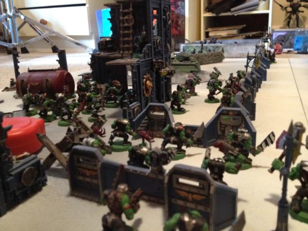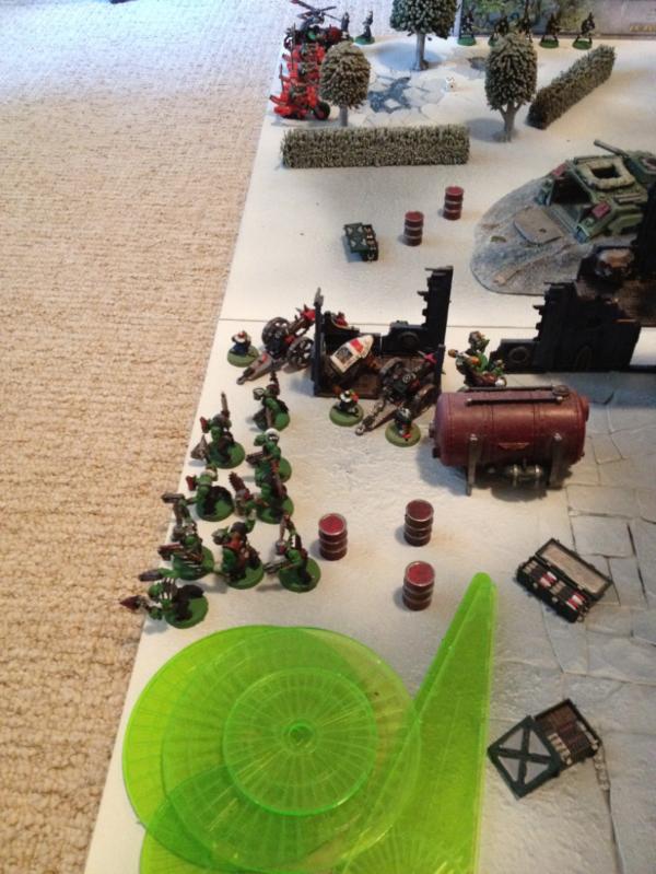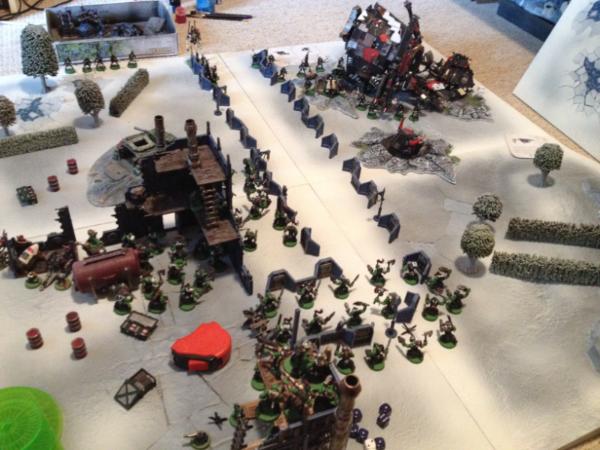 Boyz mob one would hold the obj furthest forward, the Grots would hold the 2nd and Boyz two would hold the one at the aegis line. The Stormboyz would pressure the Eldar lines as a distraction with the Lootas and Artillary as fire support.