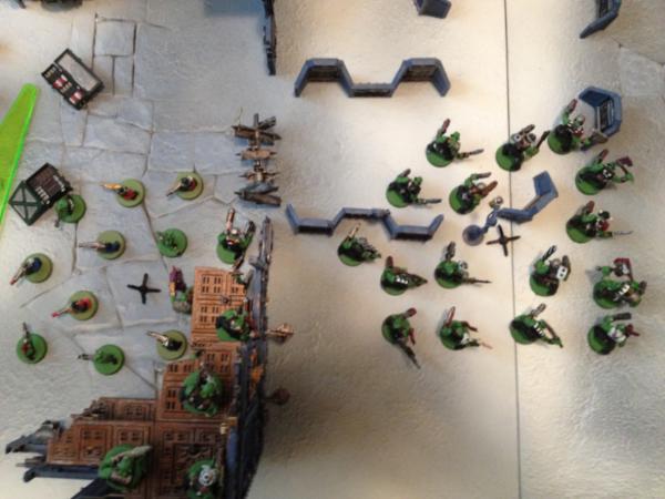 LoS with their shootas/big shootas. Boyz mob two alos moved forward slightly for range, still holding obj 2.