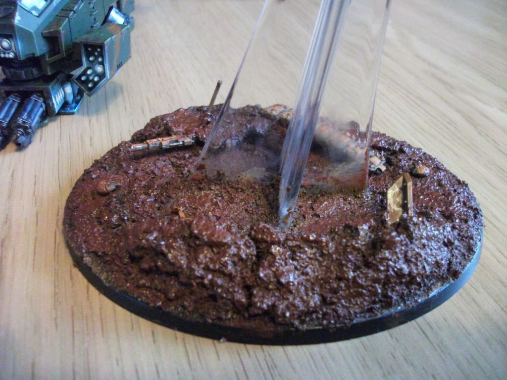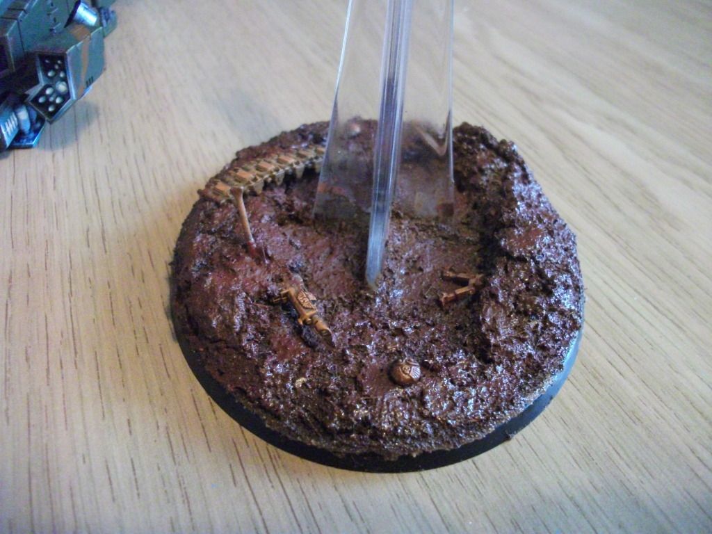 Love the model and the paint job. The base does need foot prints. Also Muddy base needs mud puddles. Try a little "very watered down graveyard earth" and mix it into water effects. Perhaps add a little into the foot prints to give the Illusion of rain. Just a thought. Great stuff you got there!!