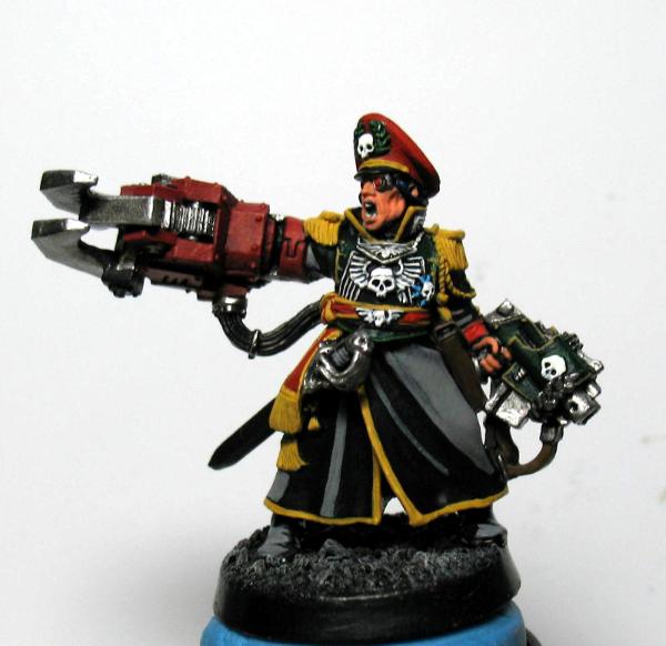 For the armor use a brighter grey and hit only the hard edges of the armor. Then for a select few edges that catch more light, edge again with Skull White or some other nice white. Remember to thin down your paints to a good consistency so you don't get paint flakes or caked paint on those edges. Don't put any black wash over the highlighted edges of the armor.