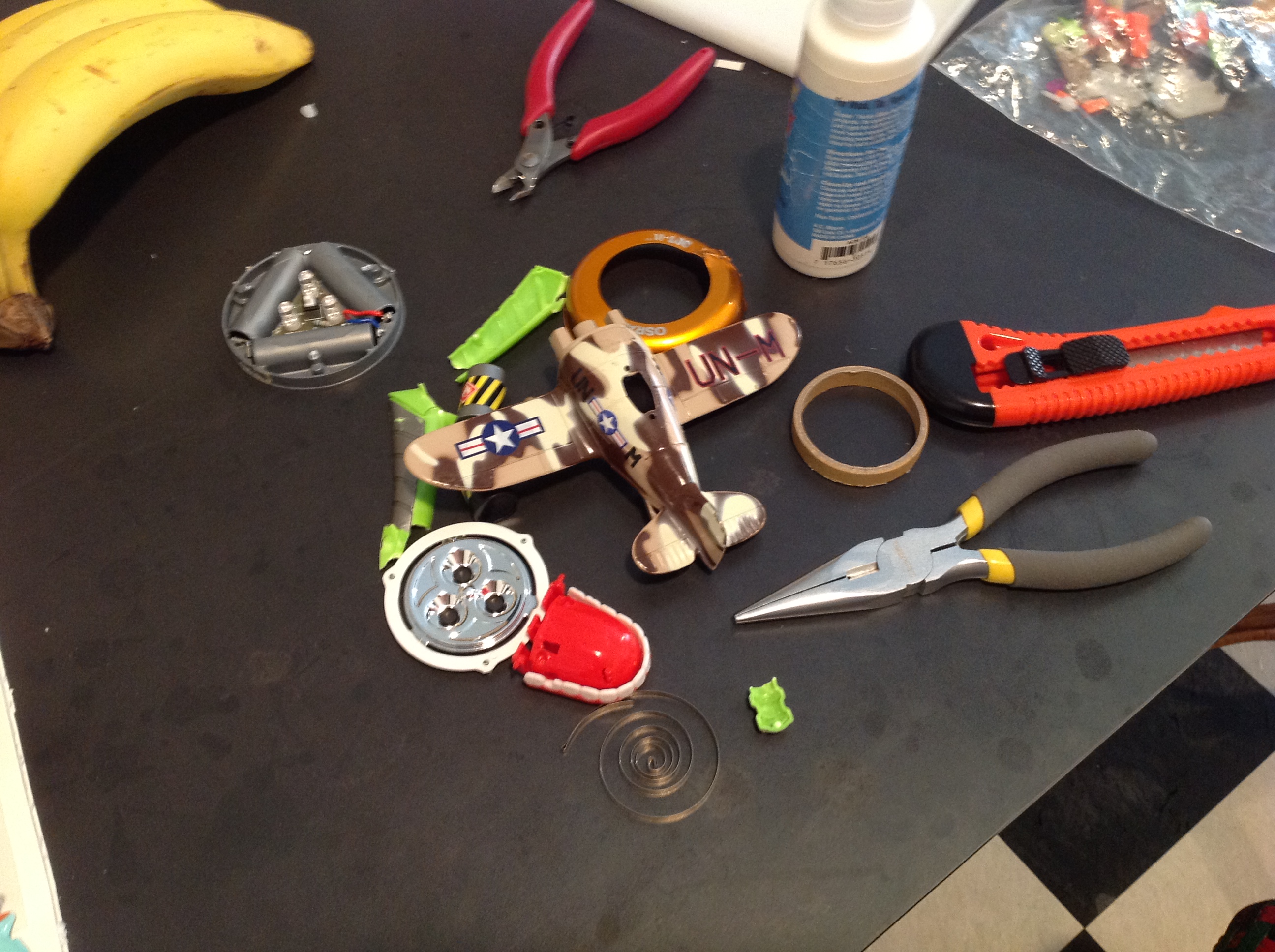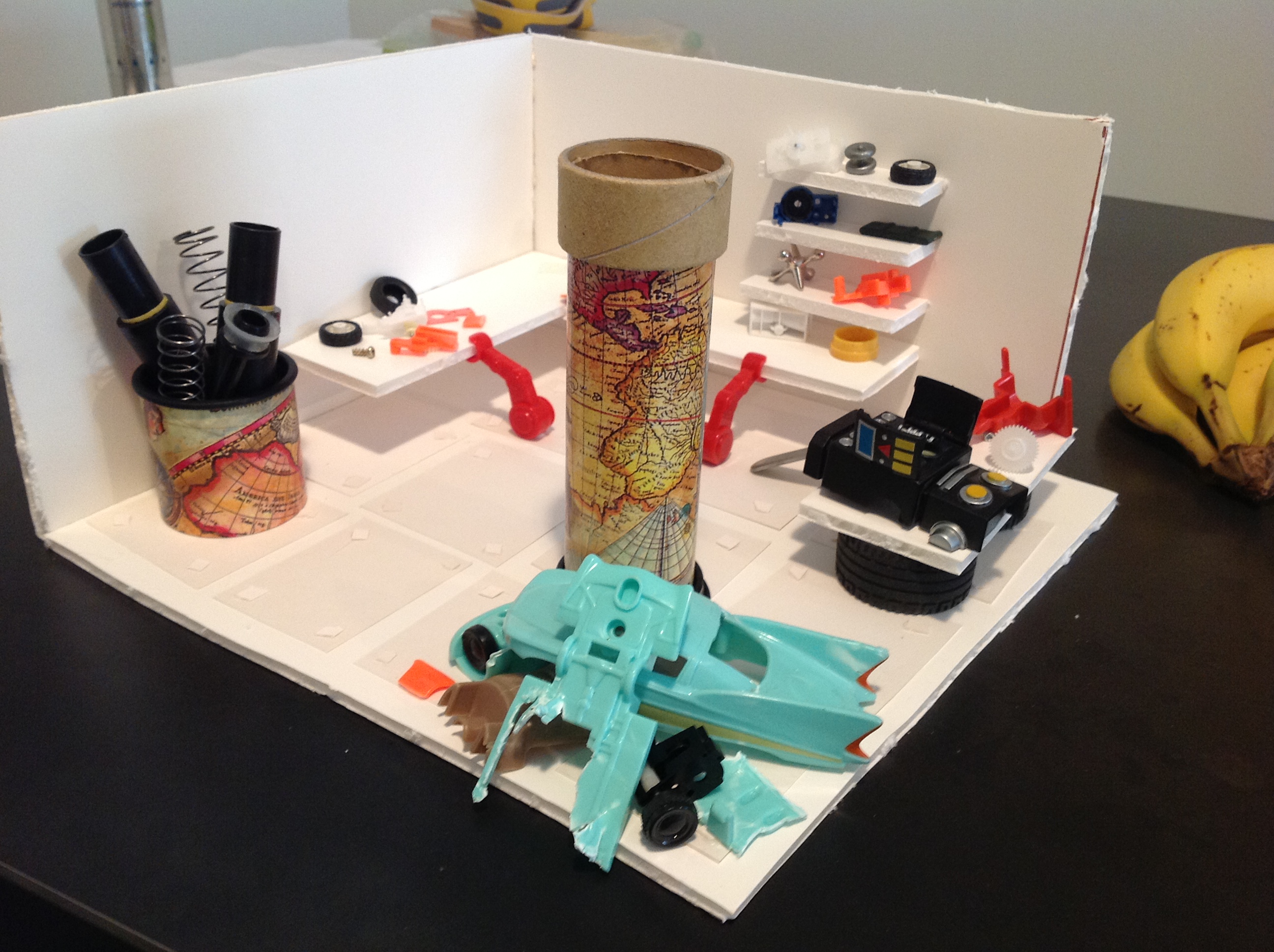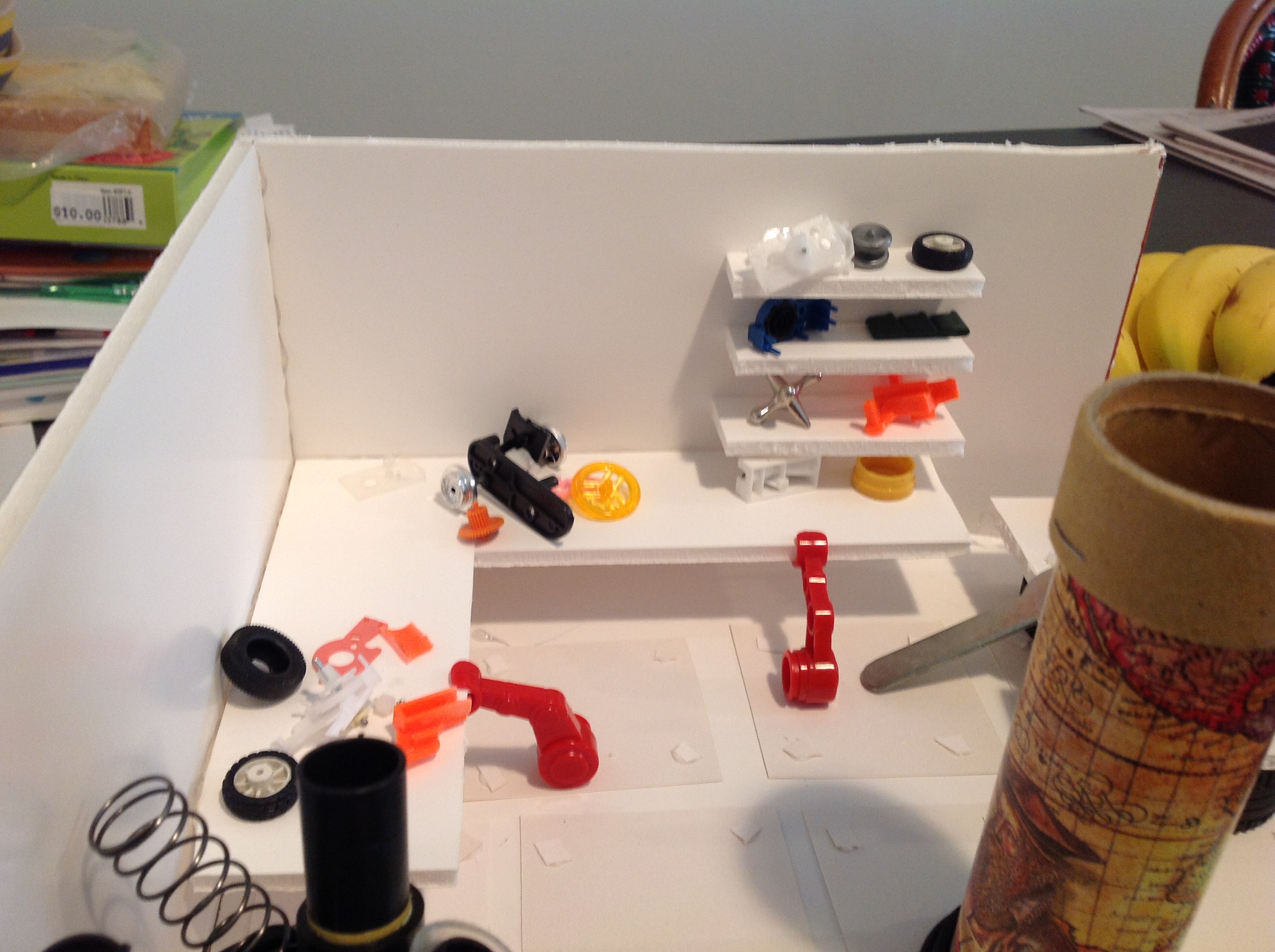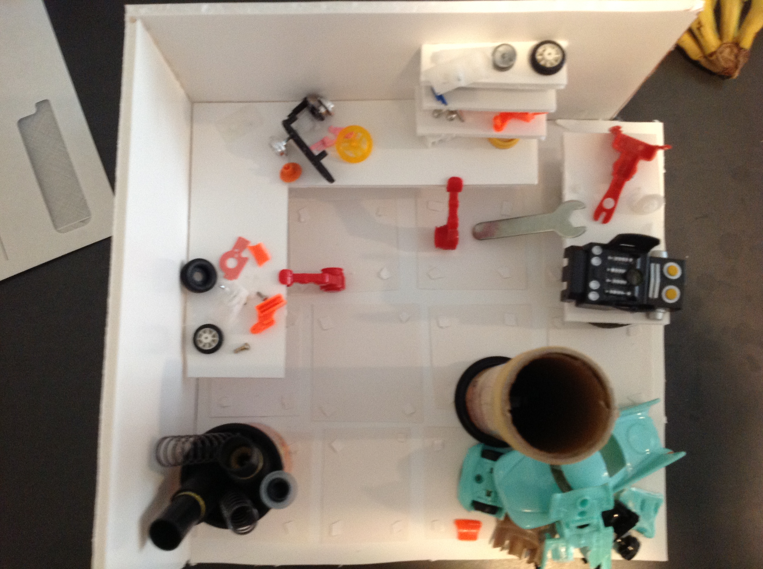 This looks pretty good so far. The robot opened for repairs on the table is a nice touch, as is the disassembed car - mechanics are forever leaving works in progress here and there, and Big Meks are no exception. It's currently looking a bit too clean to be a Mek's workshop, though - you need more shelves, as well as things mounted on nails/brackets on the walls. Look at pictures of auto shops and electrical hobbyists' spaces and see how they use every available inch of wall space to hang and mount tools and parts.