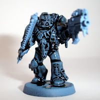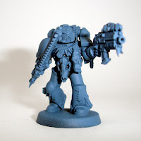 Then use lighter colours again to pick up on the raised area's that are perfect for highlighting. This time using a much more subtle conservative dry brush, finishing with a very light blue or gray or even a pure white to pick up the very edged of a area's in the open light like in the case of a space marine the corners of the shoulder plates or leg plates.