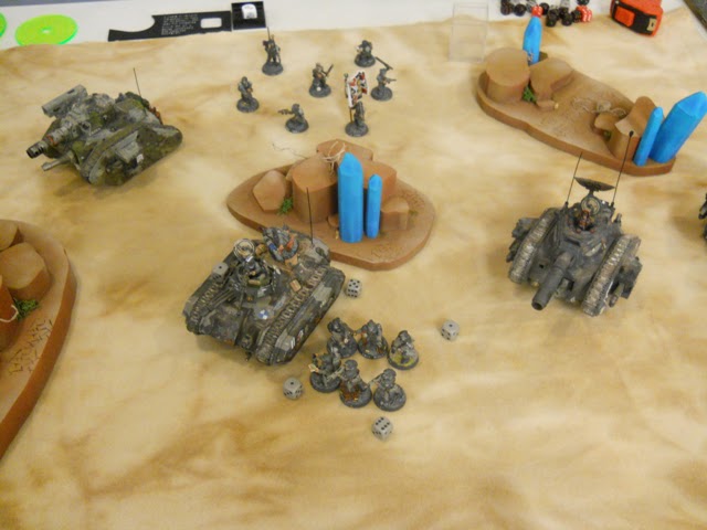 The Blood Crushers are expecially close, and one Grinder shoots and immobilizes the Basilisk (we realize a moment later it is really Explodes! due to it being open topped and I get First Blood) and the other grinder takes out all but one member of their
