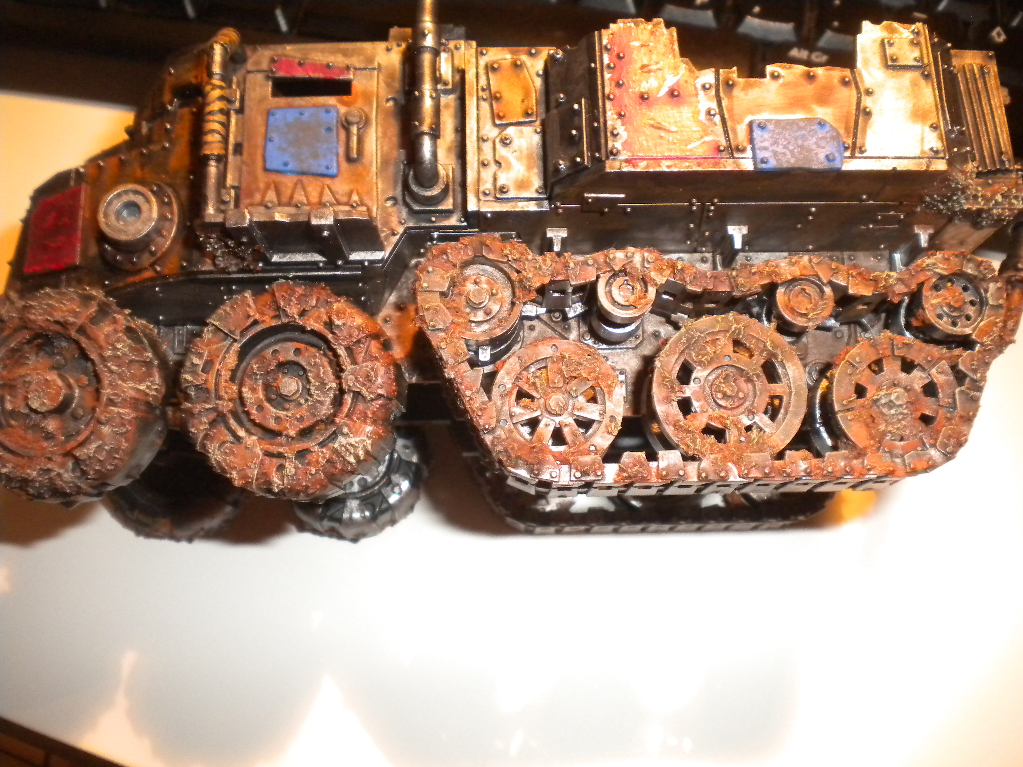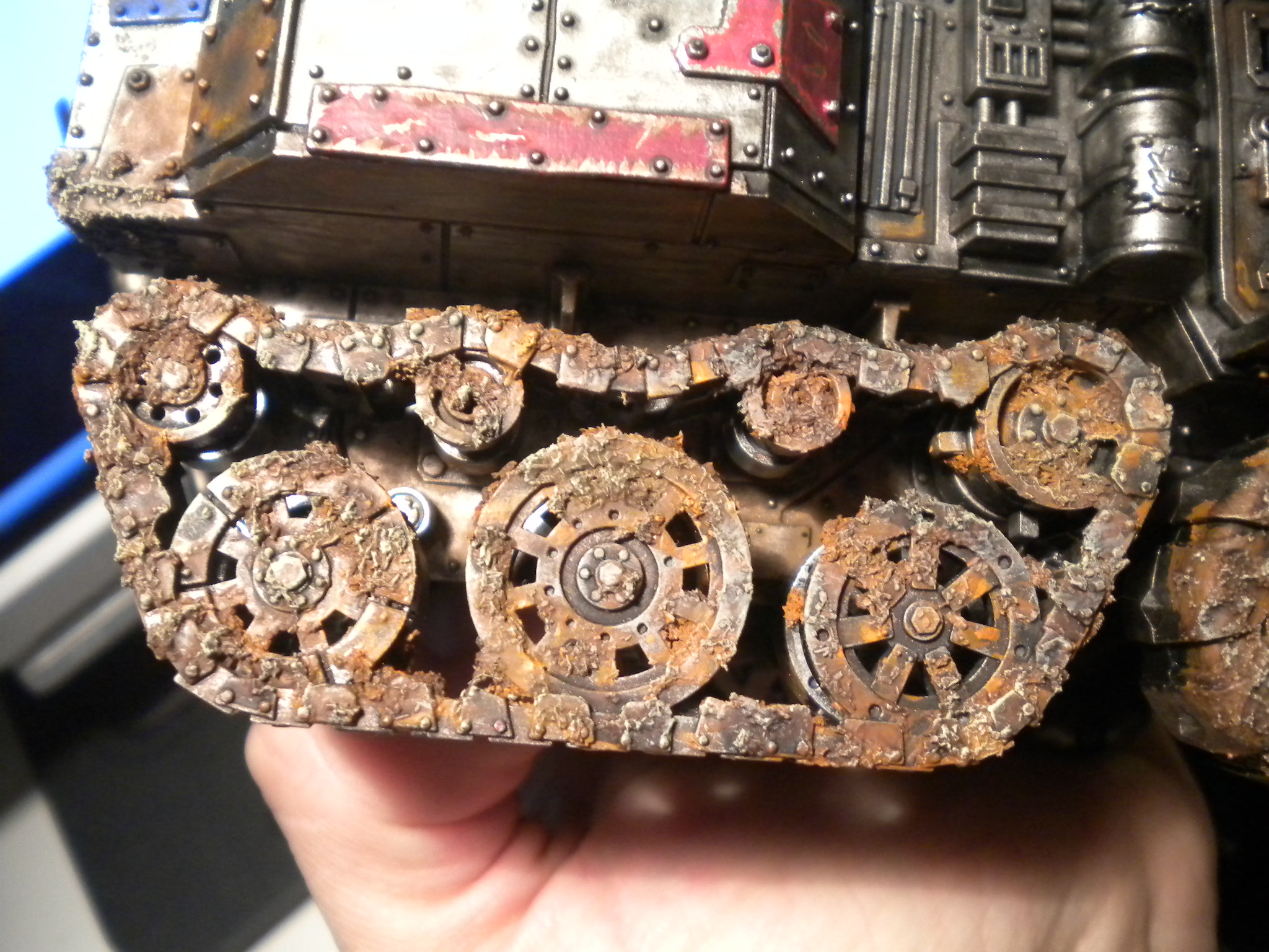 I did a basecoat of black, then covered them in Tin Bitz. Afterwards a thinned down coat of chainmail. Then I used devlan mud and added a selfmade kind of sandypaste made from bestial brown and some modelling sand (on the wheels it's one of the new texture colors by GW). Another heavy wash with devlan mud and finally some drybrushing with underhive ash. A watered down troll slayer orange was used to indicate some rusty spots here and there. As it is a layer paint, it blends nicely over the bestial brown.