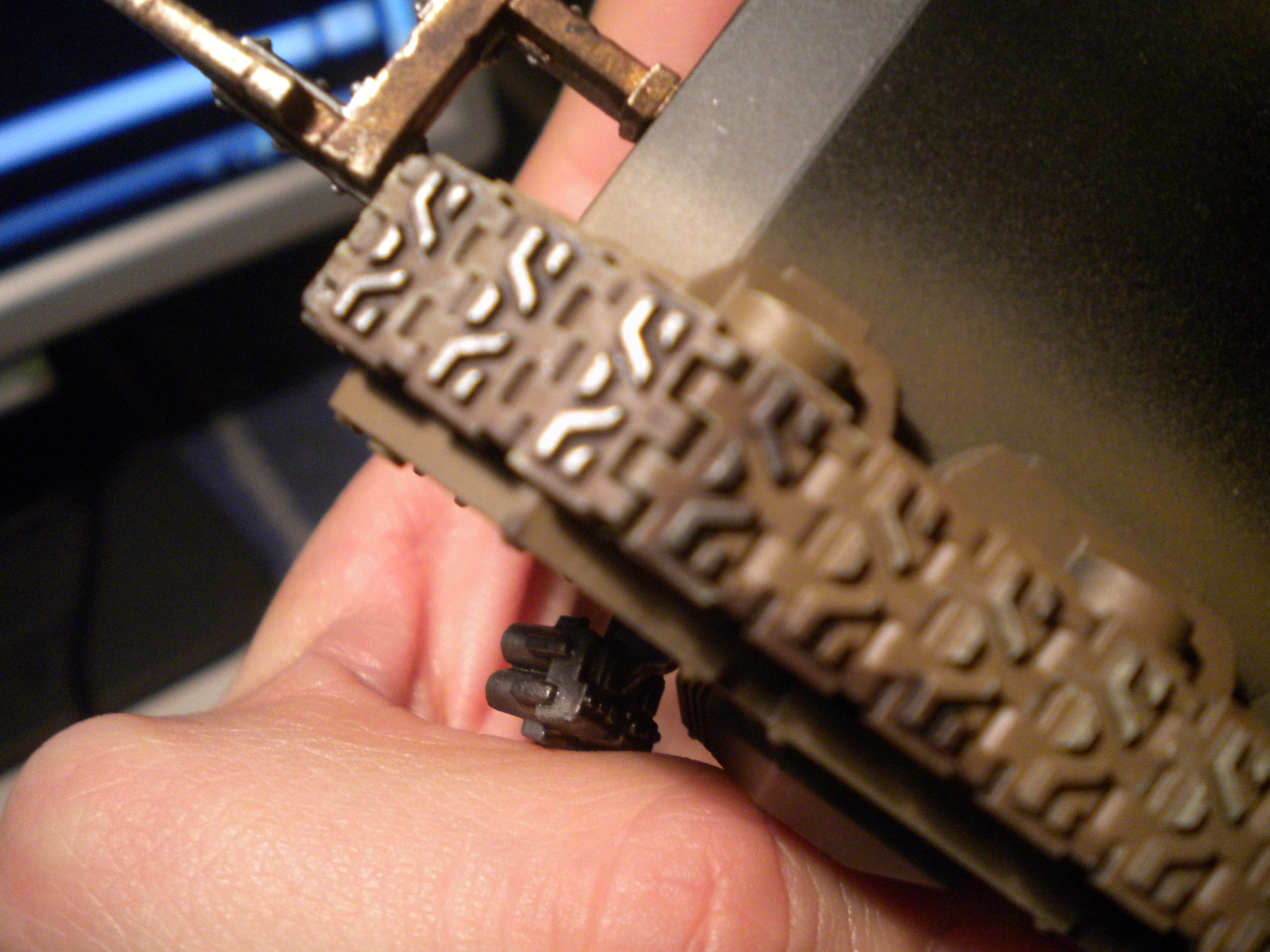 the treads on my rhino were done by a friend of mine: black undercoat, then steel legion drab, a drybrush of underhive ash and finally a drybrush with boltgun metal (sorry for the lousy picture. I hope you get the idea). He used an airbrush for this model btw., but I think you might get a good result with a brush, too, as it's not a flat area!