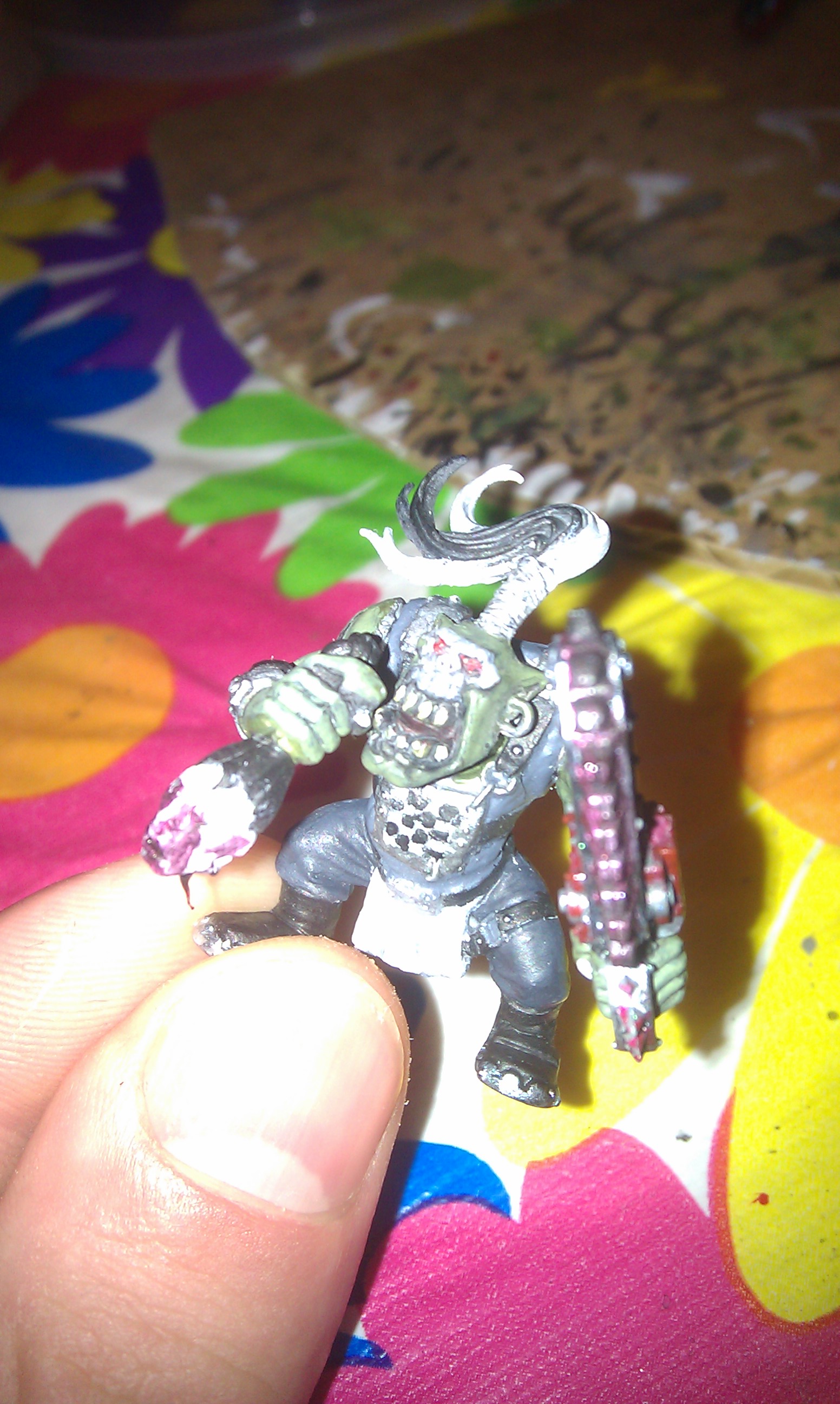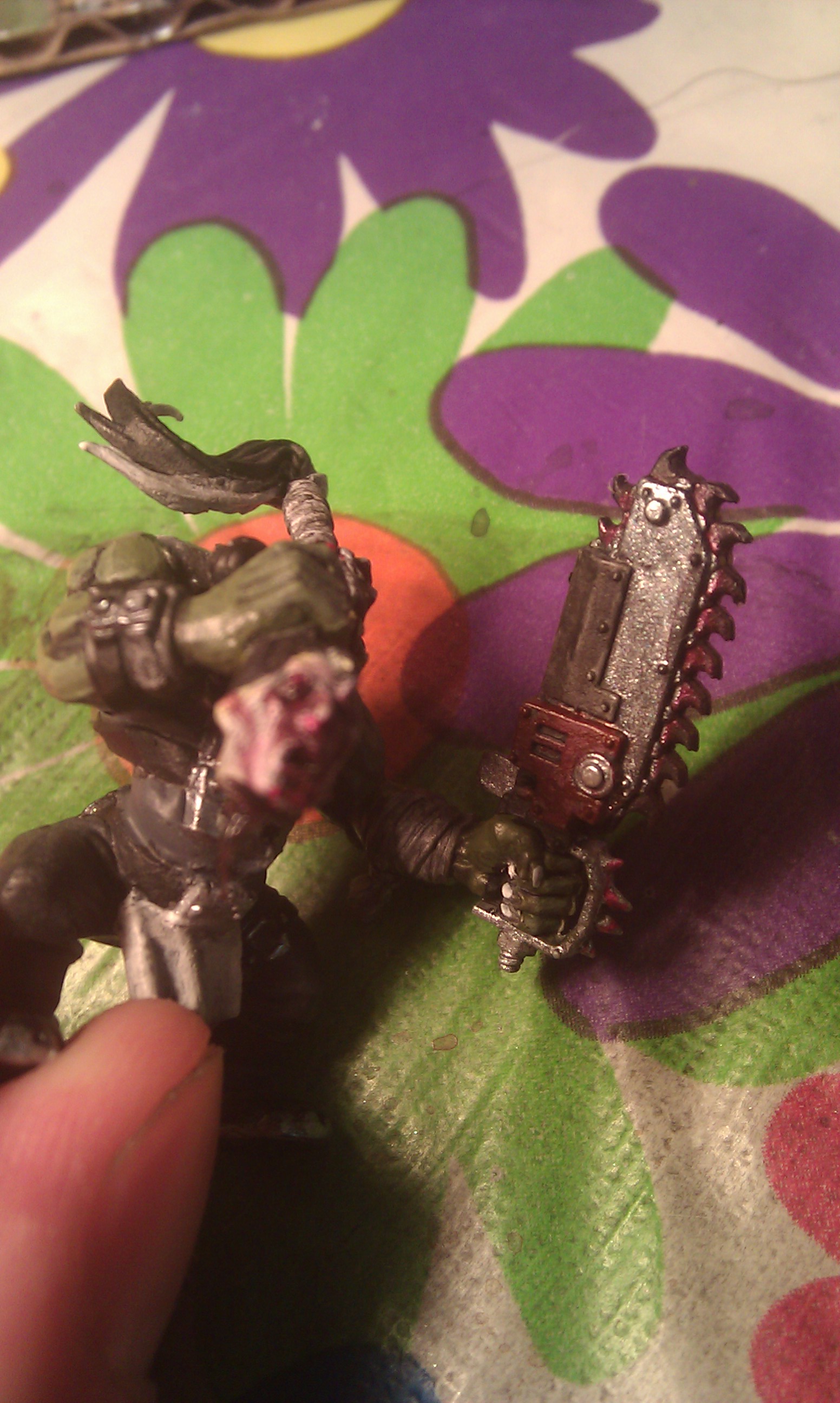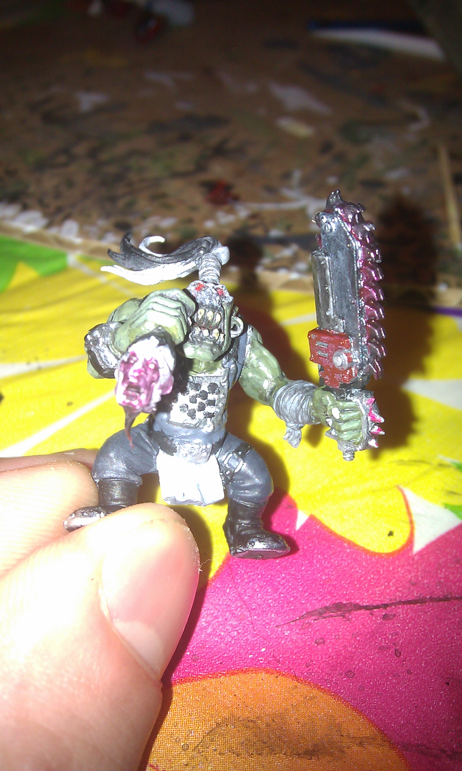 Subject: goff ork with chainsaw holding a decapitated head