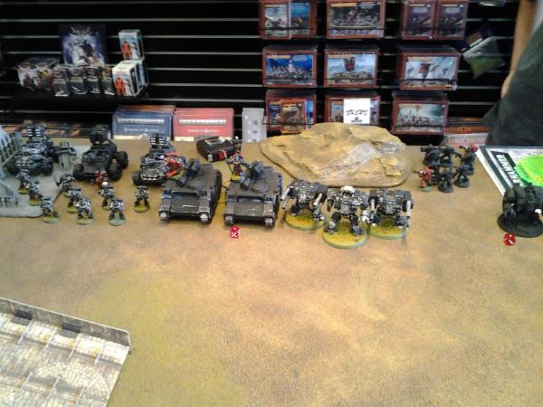 Lib. Dread, (assault marines inside the razorback), 3x Rifleman Dreads, 2x razorback with assault marines, tactical squad with Priest, Land speeder squad (behind). The