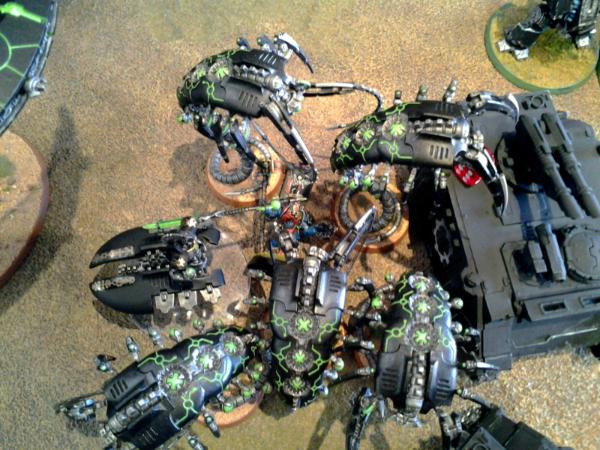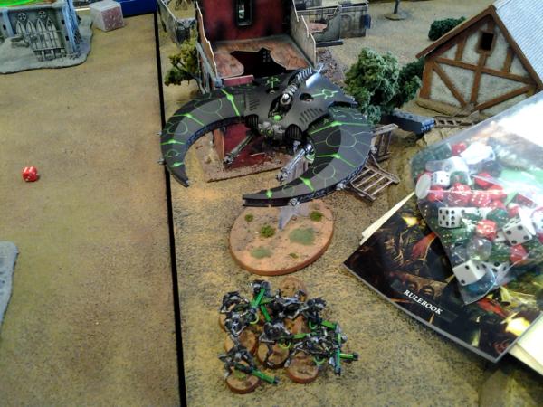 The N. scythe dropped off the warriors and flew over toward the dread. The immortals counter charged, and where able to finish the assault marine sergeant. Between some shooting and wraith close combat, the last dread was brought down. Thus at the end of T5 there were no remaining
