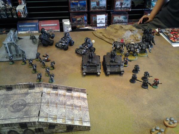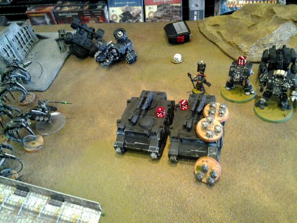 Due to nightfighting, almost nothing happened thanks to the libarians 5+ cover within 6 inch aura power. With everything shooting, I killed one speeder, and got 1