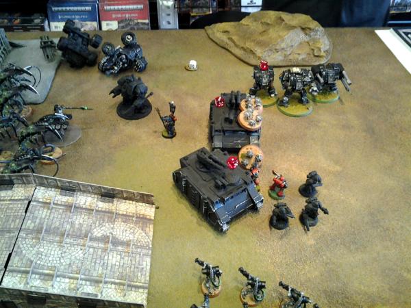 Ok, a few things happened here that I’ll explain. The four Scarabs on the right were originally going to charge one or two dreads. However, I rethought this idea, since I might lose two bases to 4 twin-linked insta killing autocannon shots, and then might lose another base at I4 in close combat. Thus I chose to charge the Librarian and the right razorback. In that combat the Lib killed one base (thanks to S6 staff), and I did two glances and a pen to the razor. Thus I won combat by one, he ran, but I failed to catch him. Thus the scarabs and the Librarian are where they are in the picture. Also, Bruticus and buddies killed the tactical marines and priest to a man just barely (thanks preferred enemy), and consolidated closer.
