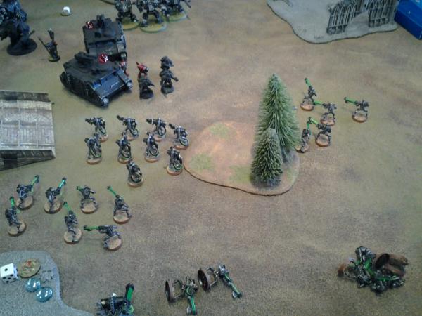 The tesla destructors on the scythe and barge where able to finish off the middle dread, and the closest razorback. Small arms fire killed off 4 of the assault marines in the middle, but the sarge was the sole survivor.