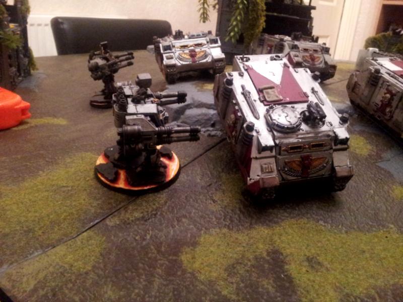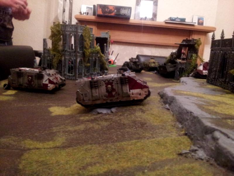My turn; I move my Rhinos closer as after some pre-measurement I find they are not in range. One Rhino lingers behind and remains in position so can lay down dakka on Logan. Rhinos paired on the flank reverse down so their rear is facing towards Shaun's table edge and both draw LOS on the Chimera which is by the objective in the large ruin.