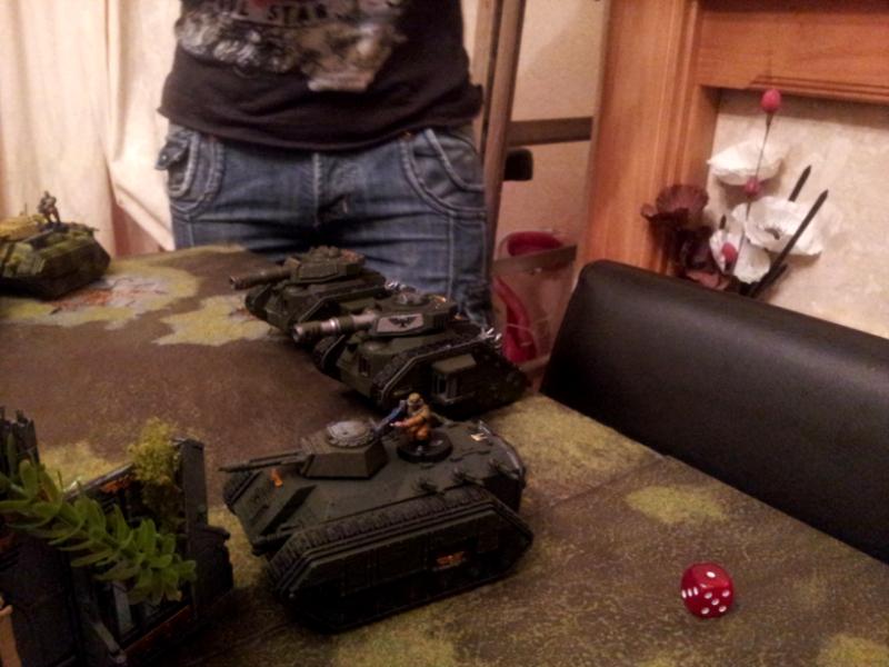 Shooting; one Leman Russ takes a crack at a Rhino and scores weapon destroyed. Other Leman Russ blasts one of the paired flanking Rhinos, though it misses big time.