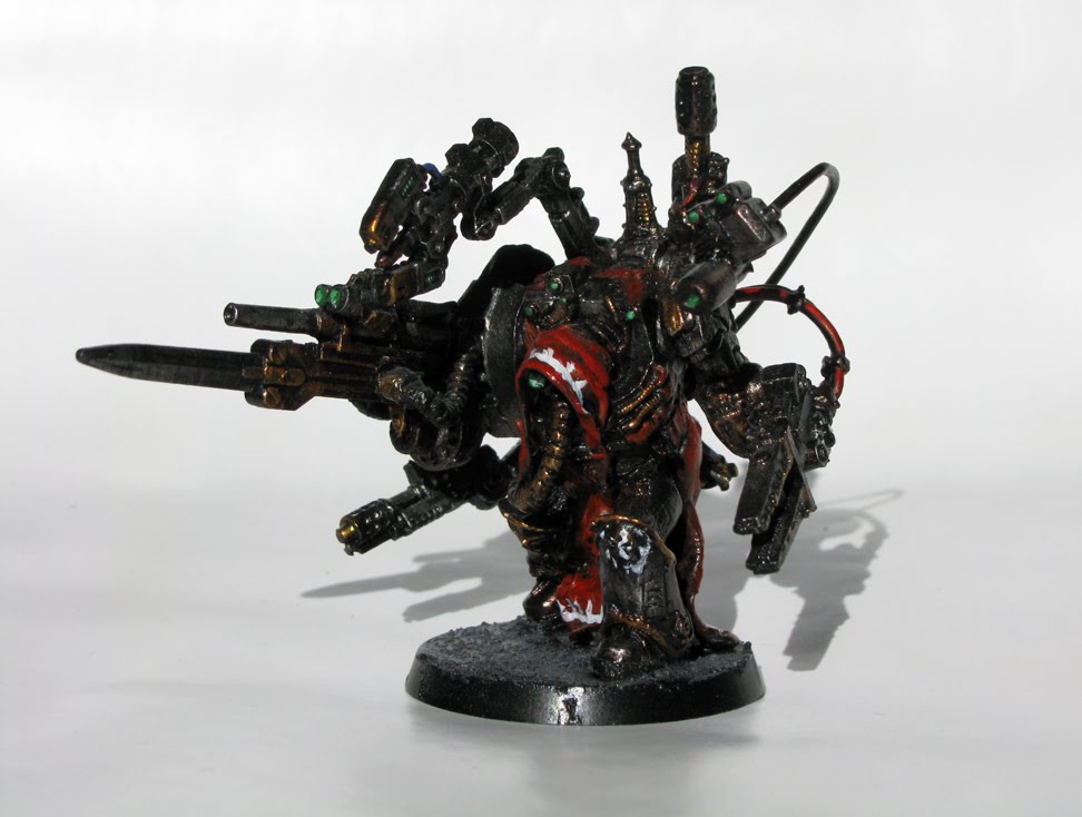 Thanks a lot - it's a dark eldar talos torso (back cut off) and head, with skaven hellpit abomination arms, daemon prince shoulders and cocatrice wings. The robes were first formed with aluminum foil wrapped around a piece of sprue glued to the torso, and then greenstuffed up. Same with the back.