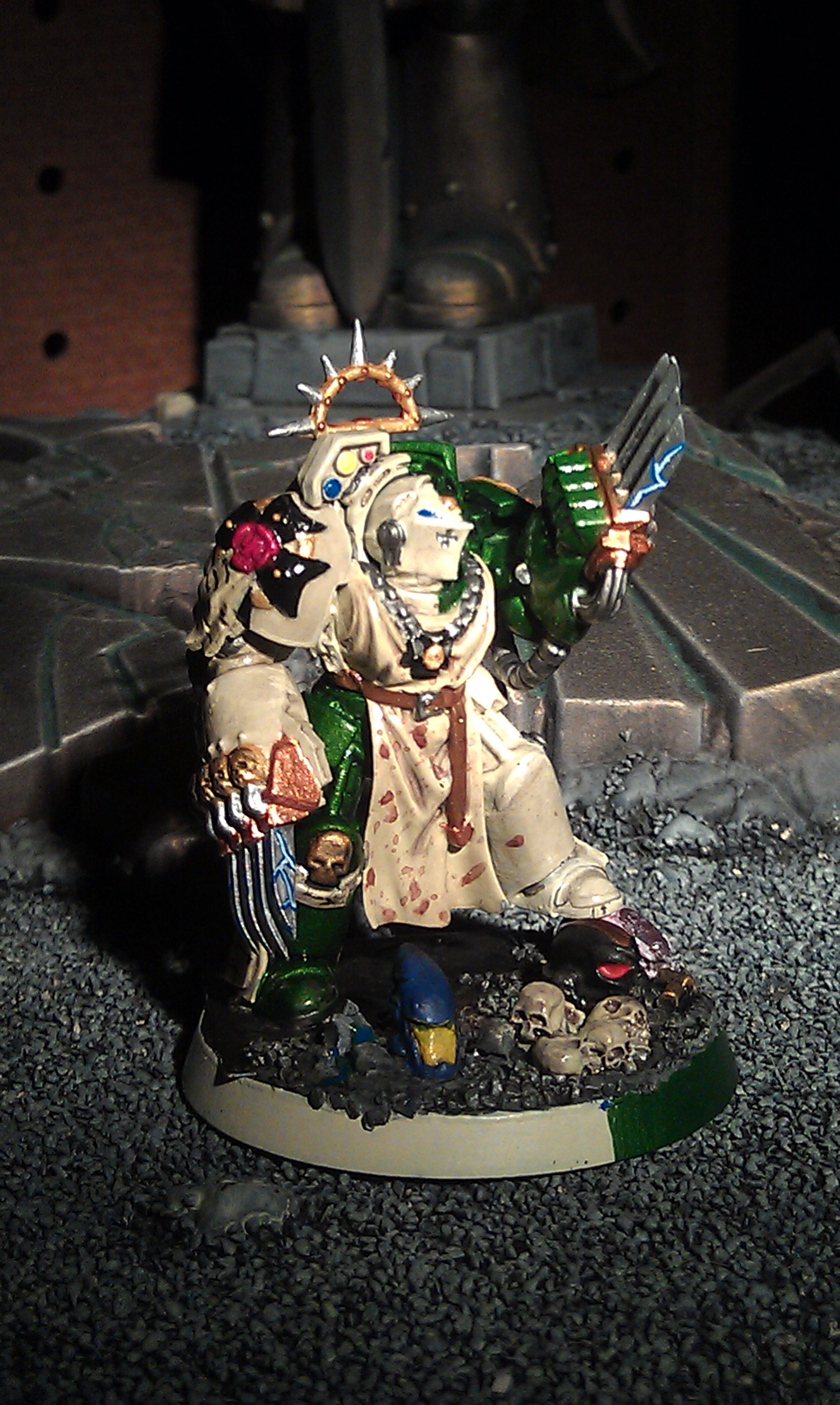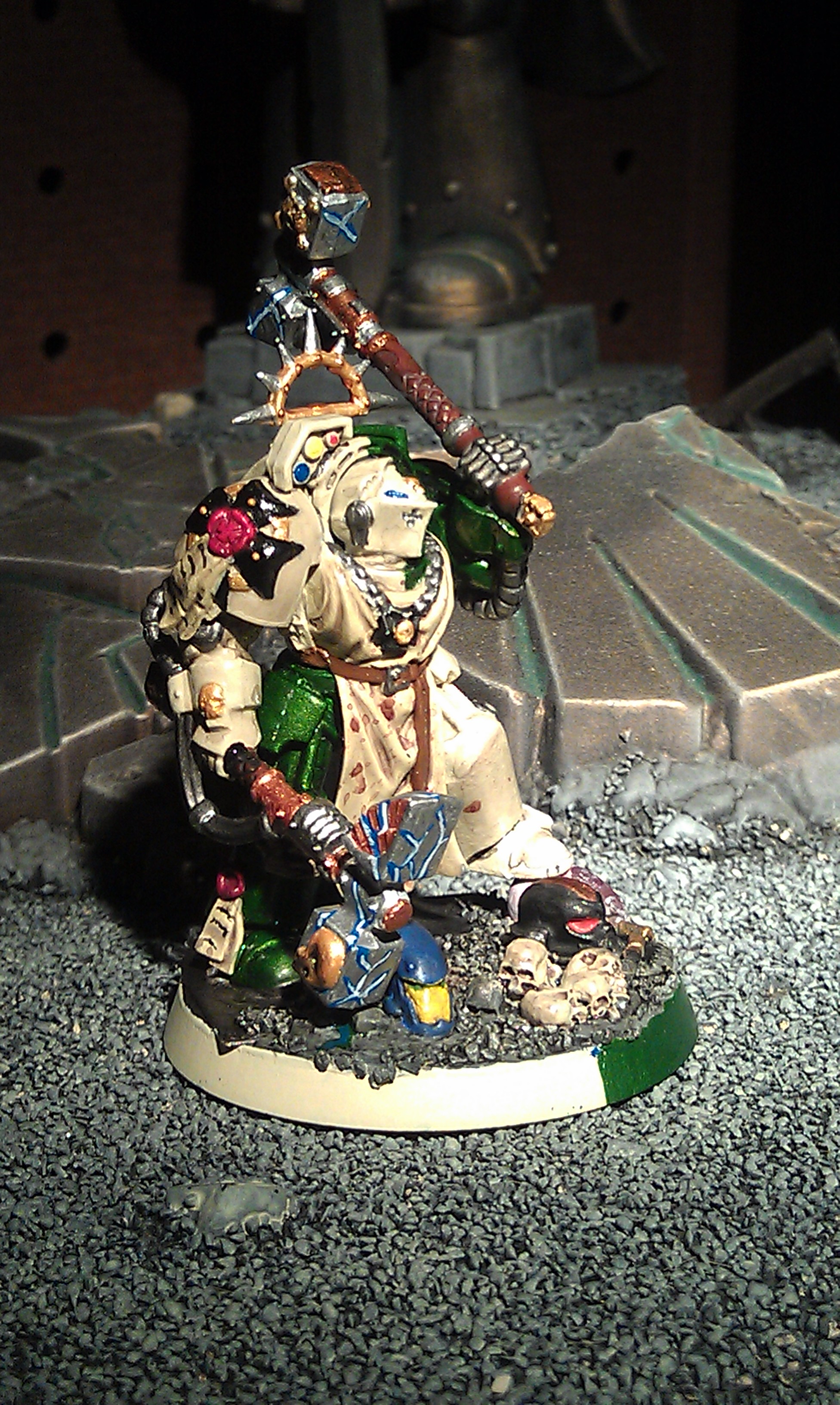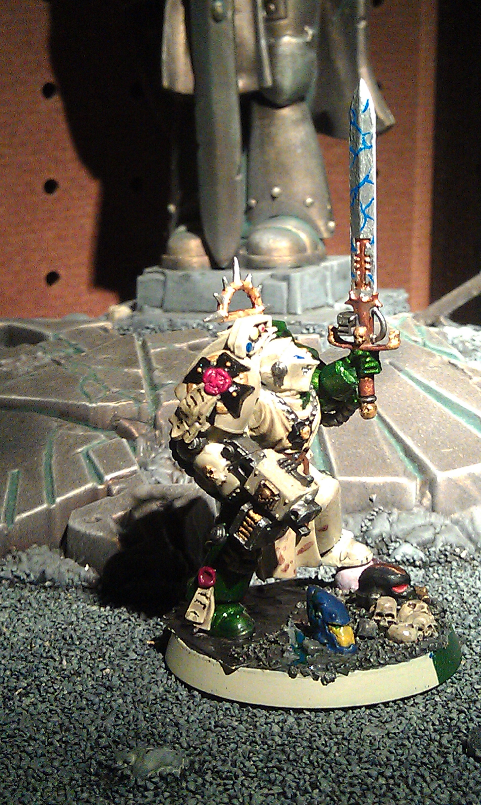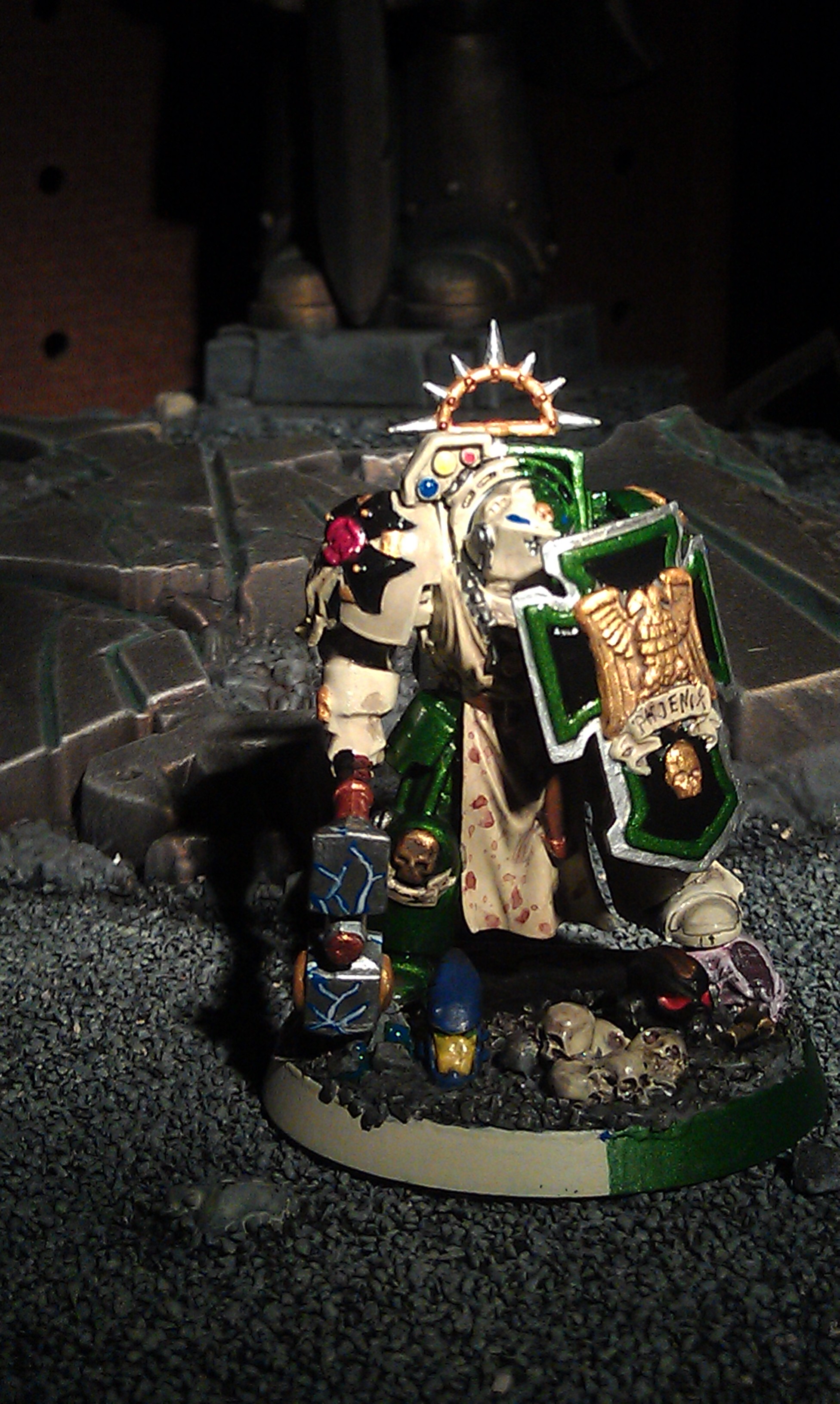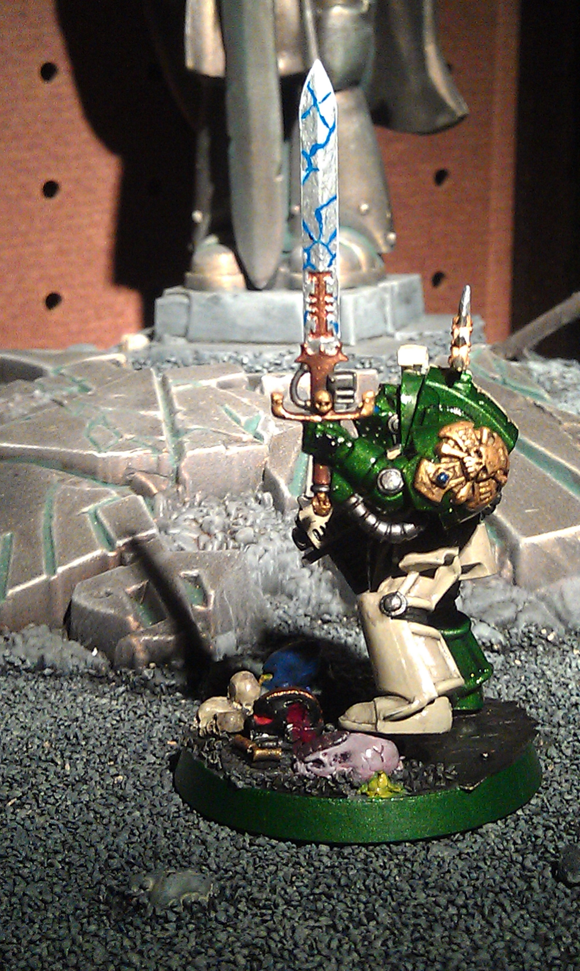 This is my take on a BT Marshall. There's inspiration from many other hobbyists (you'll recognize the use of paladin helmet), the arms are magnetized for different weapon options. I like green as a color but thought that DA's was a bit dark; I also really like the BTs iconography, so here goes... The green is a mix of DA green and Mithril Silver. I went for a quartered scheme for my Marshall, my "shooty" elites are bone-white, my "assaulty" elites are black and my "regular" dudes are green. I'm thinking of making my Emperor's Champion quartered black and green. I'm working on a name for my army. I was thinking about "Sons of Dorn" as I believe it is a real chapter, any other suggestions?