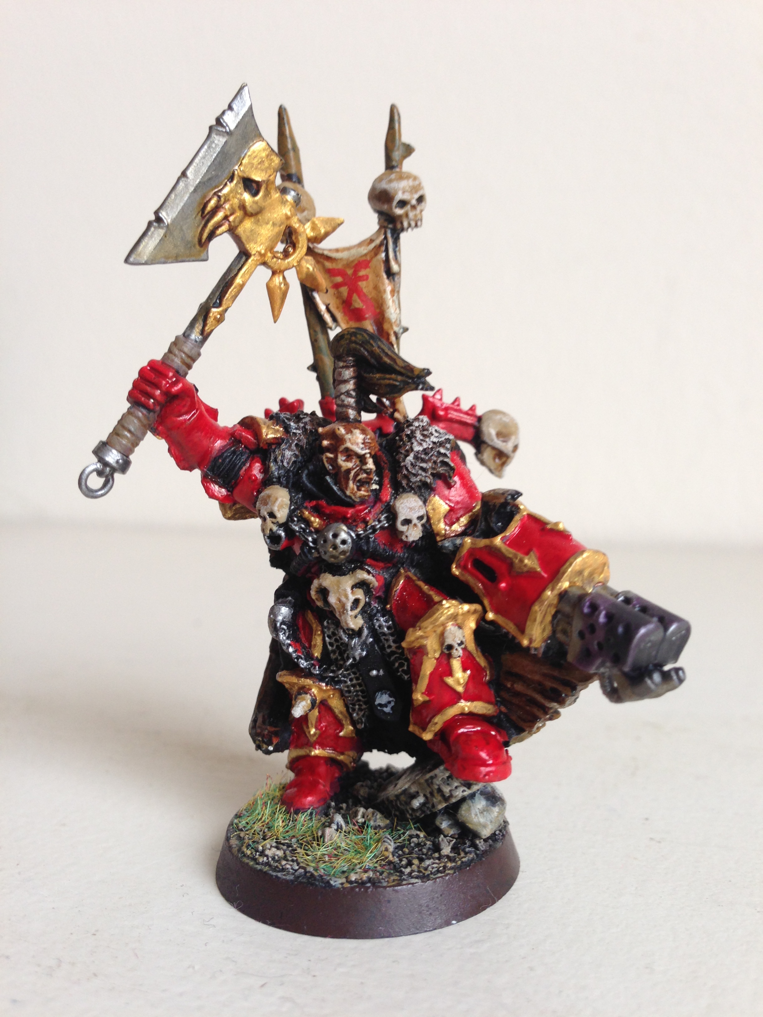 My general in-game plan is to put him in a land raider with a unit of berserkers or some such, disembark, burn the target a bit then charge in with the axe of blind fury and get choppin'. I think Khorne will be satisfied with that