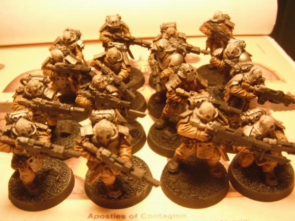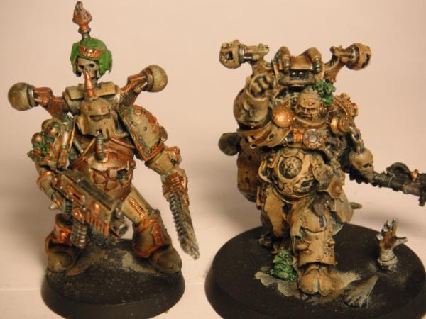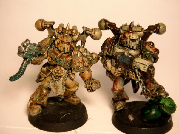 Necrosius, the self-proclaimed 'Hand of Nurgle' and former chief apothecary of the Death Guard legion, whose real name is all but lost. An ill fated tale of woe, as disease ravaged the legion he sought to find a way to cure his brothers and worked tirelessly to this end but to no avail. "Though his dead comrades stumbled back to unholy life and his own body had become a bloated rotten husk, he continued past reason and past the bounds of sanity. It was only when he heard the voice of his new father in corruption chortling and whispering to him in the murmerous wings of carrion flies and sibilant gurgling of rotted, decaying organs, that Necrosius embraced the full nightmare truth of what he and his fellows had been damned to become, and embraced the service of his vile god." His retinue has come to be known as the Apostles of Contagion, as in their wake they leave behind fearsome plague zombies and blighted populations turned to the worship of the great father, Nurgle. The warband is most noted for the zombie plague infestations across Vraks and several other systems in the Scarus Sector. Though having seemingly suffered heavy losses during the Vraks war, rumored sightings, increased cult activity and the telltale ravenous hordes of warp zombies assailing the sector once more, suggest that Necrosius is still alive, perhaps un-dead. The warband is presumed to be active in the sectors near the Eye of Terror, no doubt part of the 13th Black Crusade of the Despoiler.