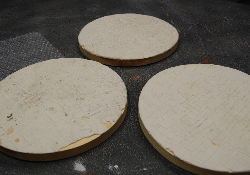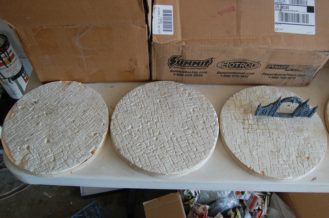 The three Haemophage bases ready to be cured. They are oven drying putty over 11" wooden discs. I have already cut the other 2 as well.