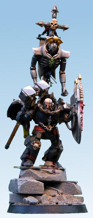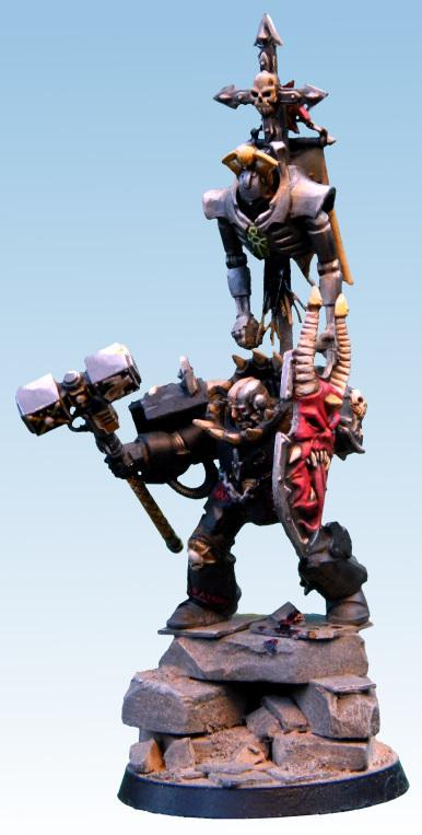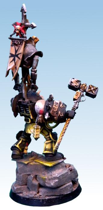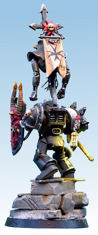 The banner is kit bashed. I stuck half of Necron Immortal (cut the weapons off the hands and stuff) on a fantasy banner pole. The cross on top is a Chaos star with four of the points cut off from the Knights of Chaos box. On the back is a banner from the Black Templars upgrade sprue.