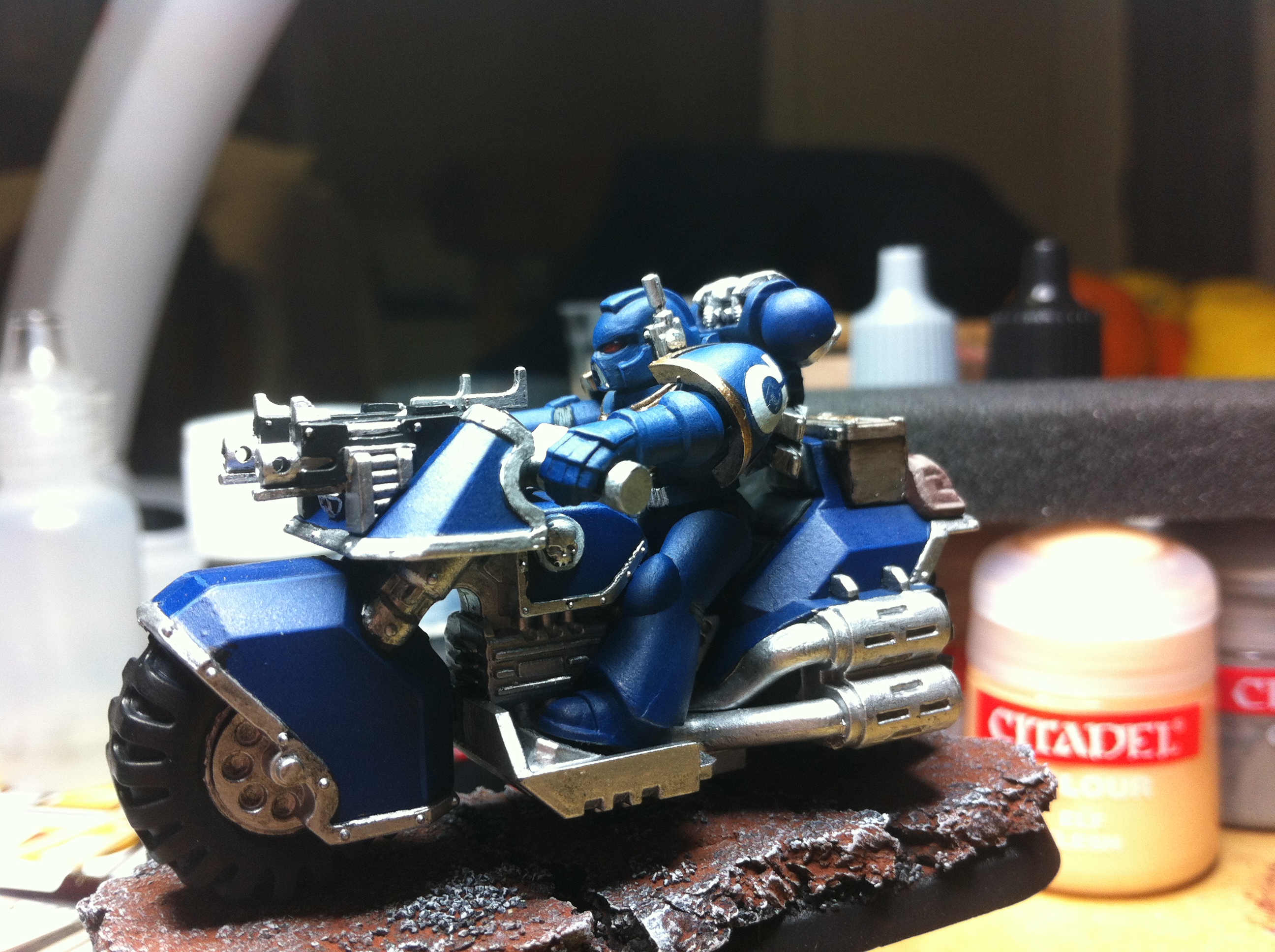 So I've done one test miniature - of course he hasn't been weathered and washed yet but he was done with airbrushing VA grey primer and some black pre-shading before applying a VGC Imperial Blue basecoat.