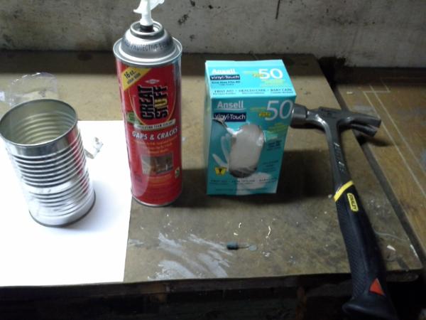 Alright. The can is properly bashed. Now, put on your protective gloves. I've got rubber gloves. Put them on. Don't get this stuff on your skin, clothes, shoes, etc. It washes off of work surfaces and tools with Acetone (while still moist). Once it's set, only mechanical means will remove it. And it's STICKY. Keep away from open flames or heat sources, and use in a well ventilated place. You've been warned.