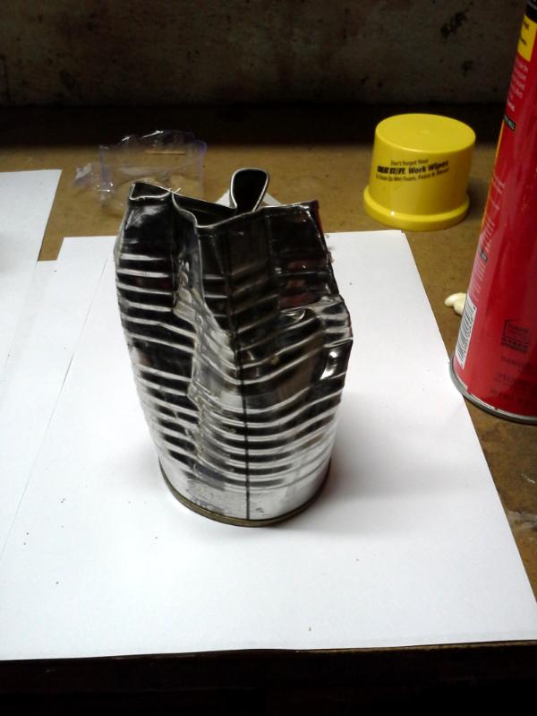 Take the beaten up can (poor guy) and set it on your paper. Gotta protect your work surface. Take your expanding foam and SLOWLY cover the can. A little bit goes a long way. A few little nooks and crannies won't matter much, but get 95% of it. Let it set away from kids/pets/bugs/etc. Surface set in 15 minutes, fully cured in 8