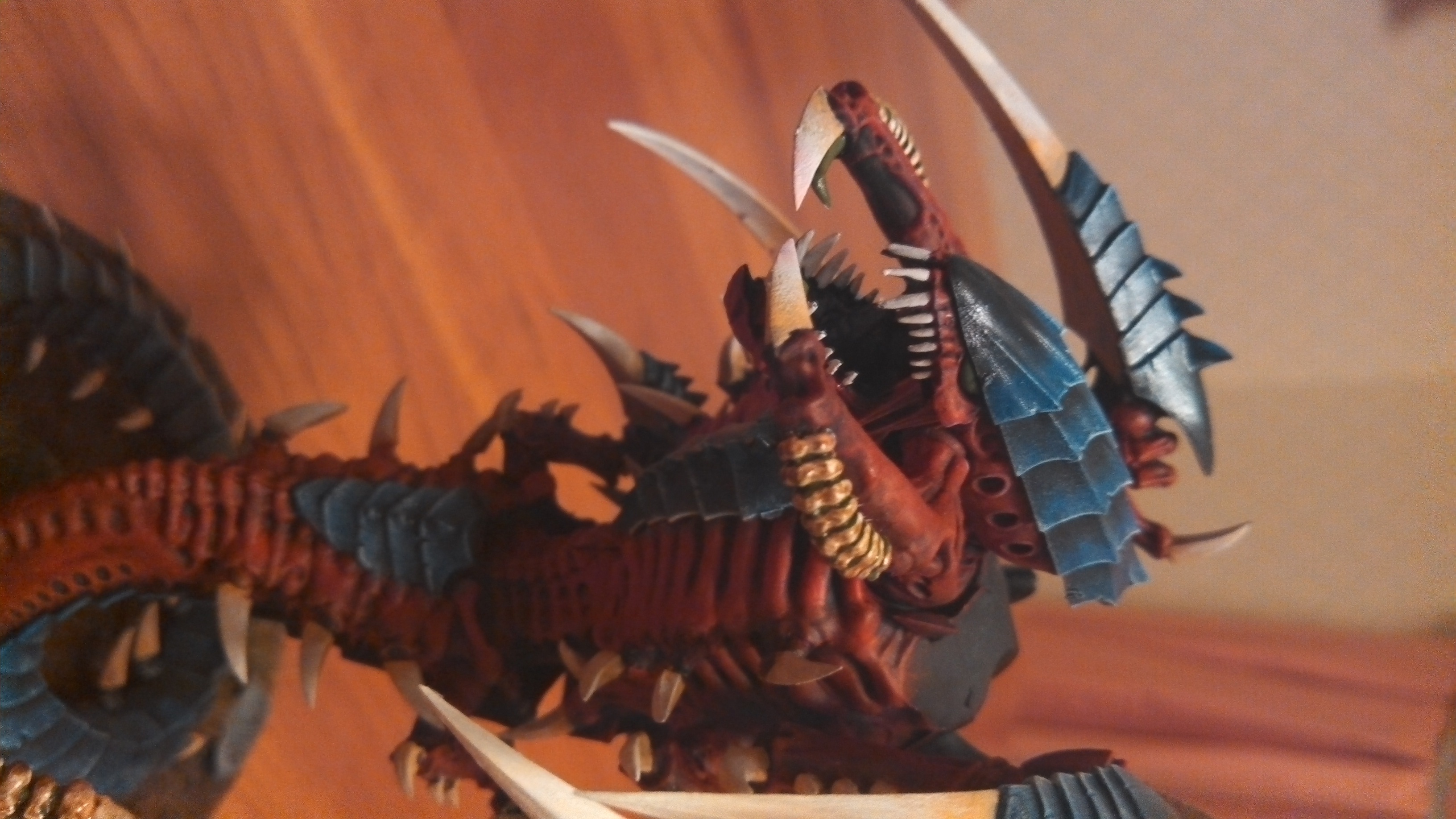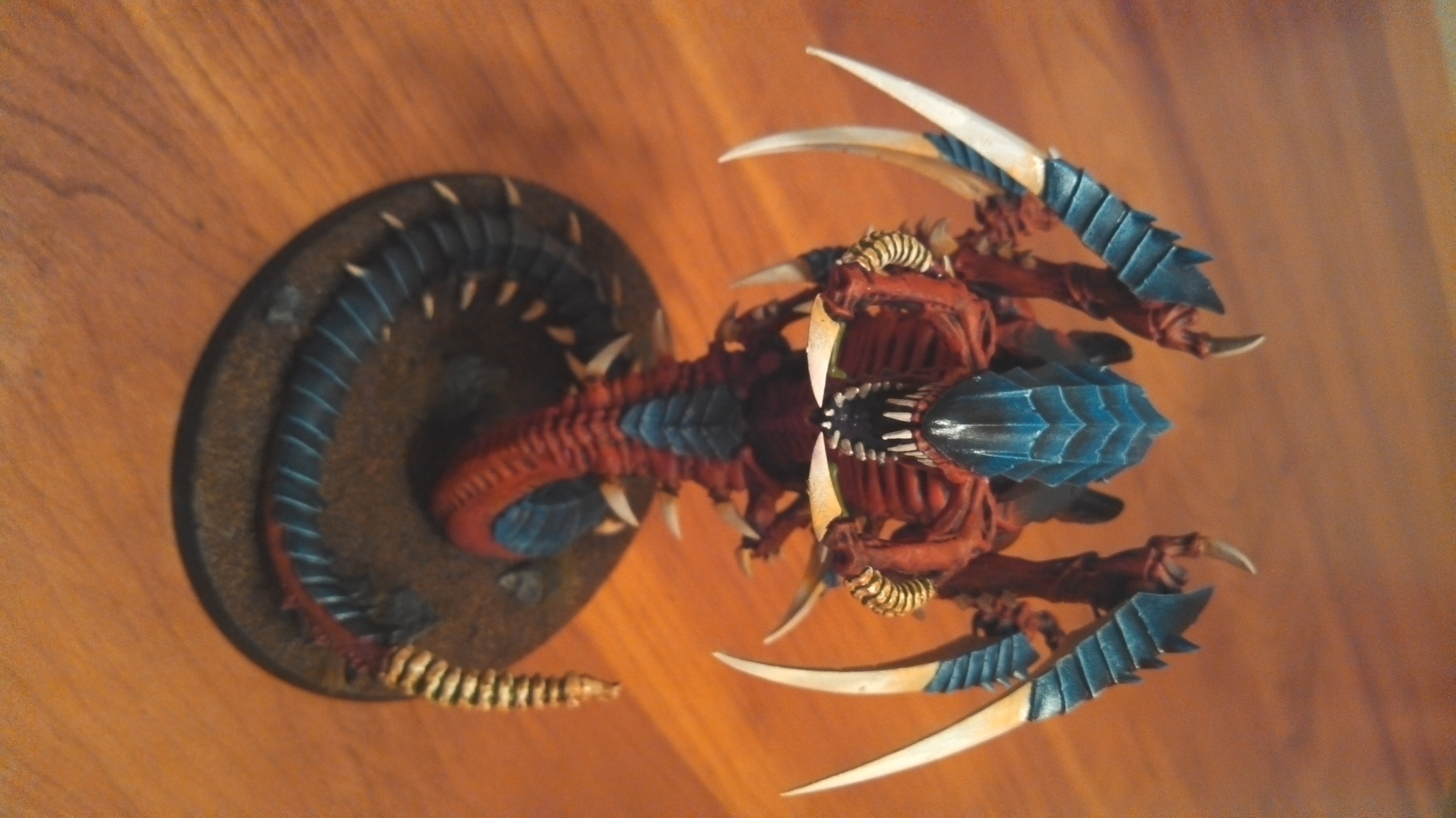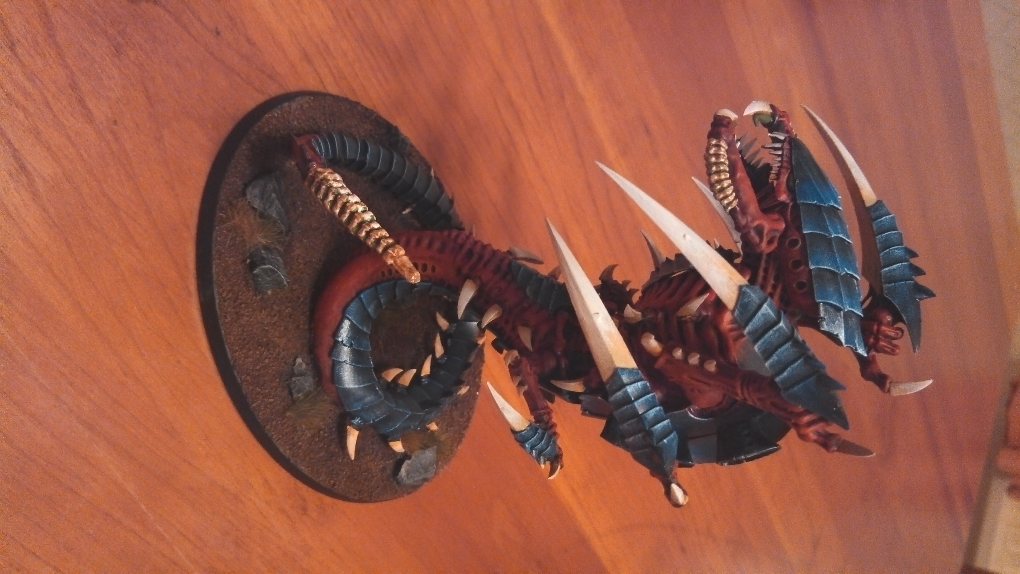 Hey this is for one of my buds who asked me to paint some of his Tyranids on commission this was my first finished model. i realize the top part of the carapace was missing but i didn't assemble the model I'm going to pick it up from him and paint it separately.