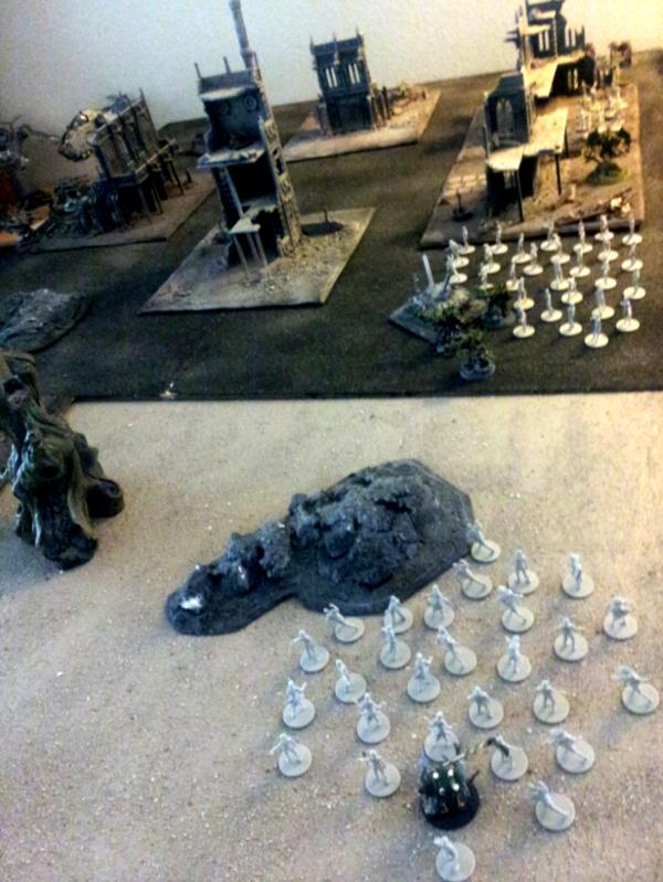 The Zombies get the right hand side, the noble Grey Knights get the left. Draigo and 2 Dreadnoughts take the middle, the Horde spans the opposing side...